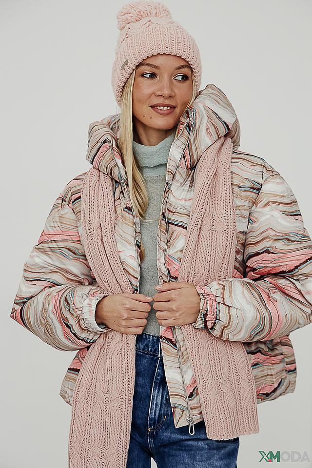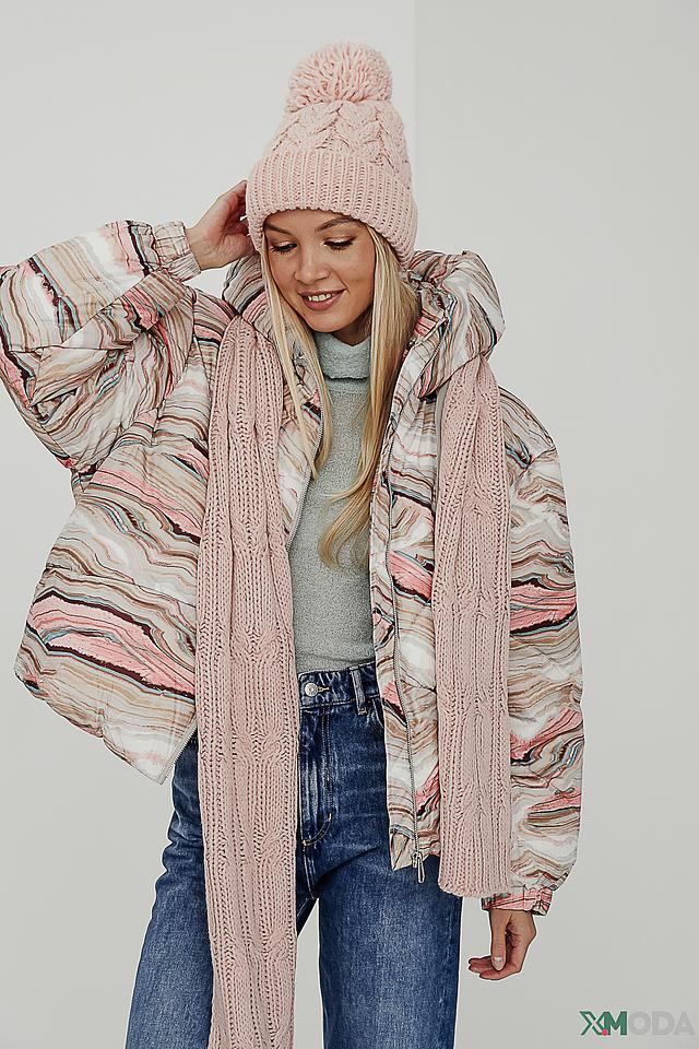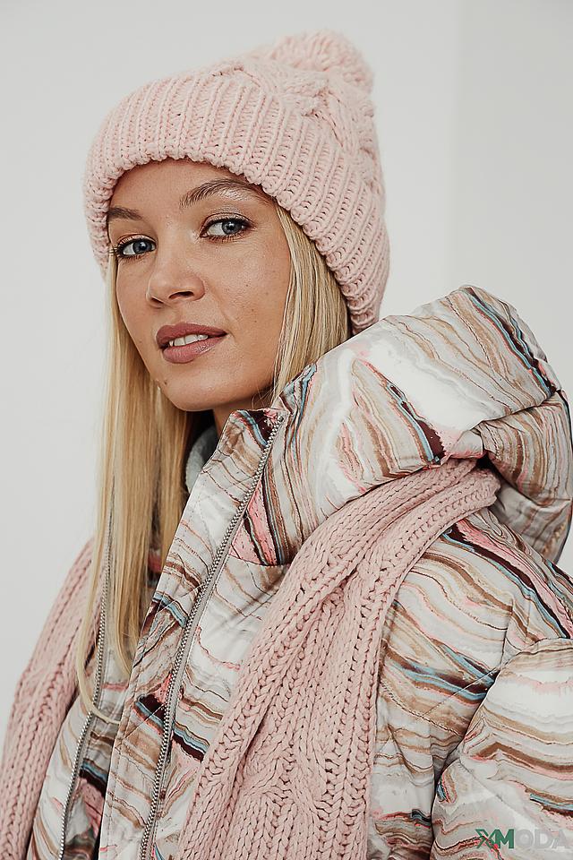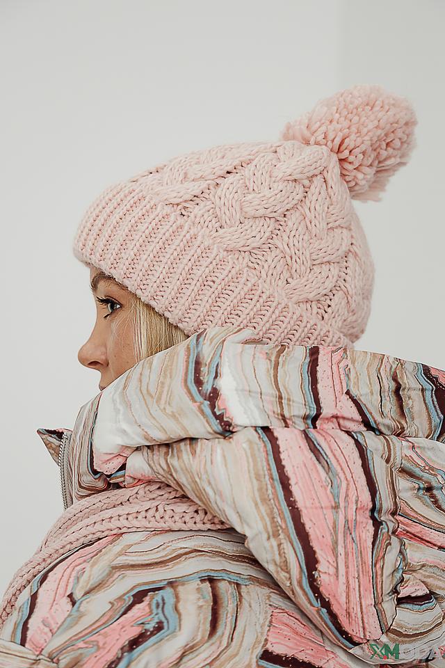 Шапка имеет классический дизайн с большим помпоном, который добавляет ей игривости и очарования. Вязаная текстура придает шапке уютный вид. Преобладающий цвет – нежно-розовый, который легко сочетается с различными оттенками одежды.