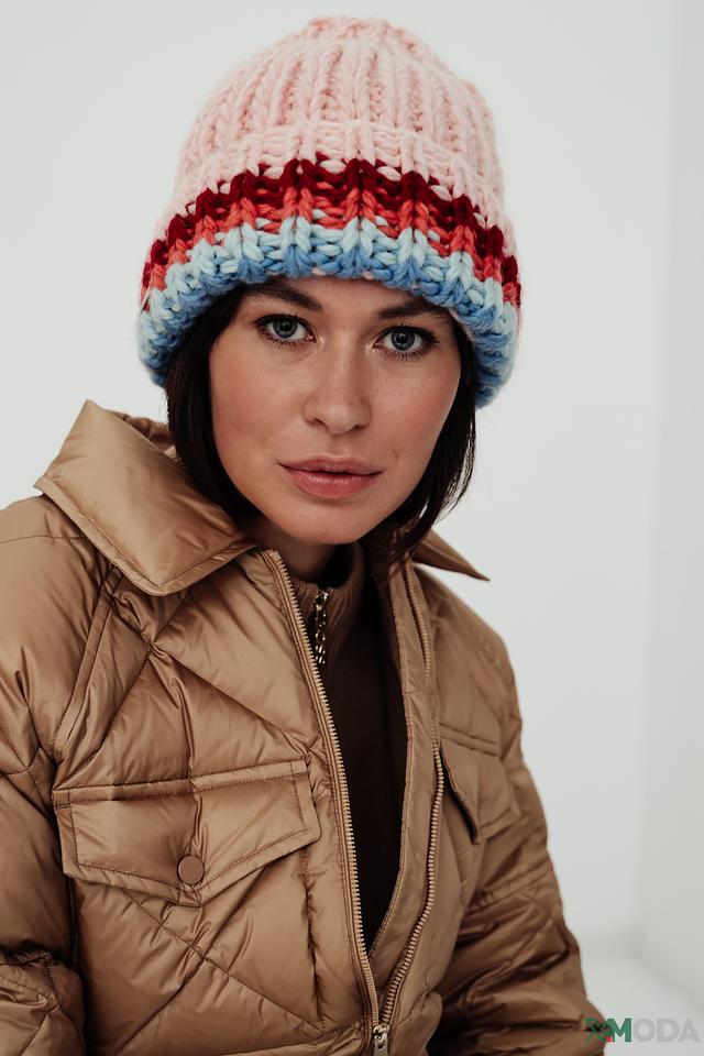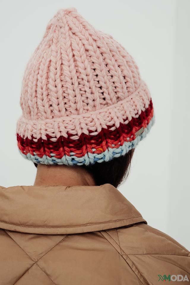 Шапка выполнена в технике крупной вязки, что придает ей объем и фактурность. Дизайн модели отличается ярким, многоцветным узором, сочетающим в себе розовый, красный и голубой цвета. Такое сочетание делает шапку заметным и стильным аксессуаром.