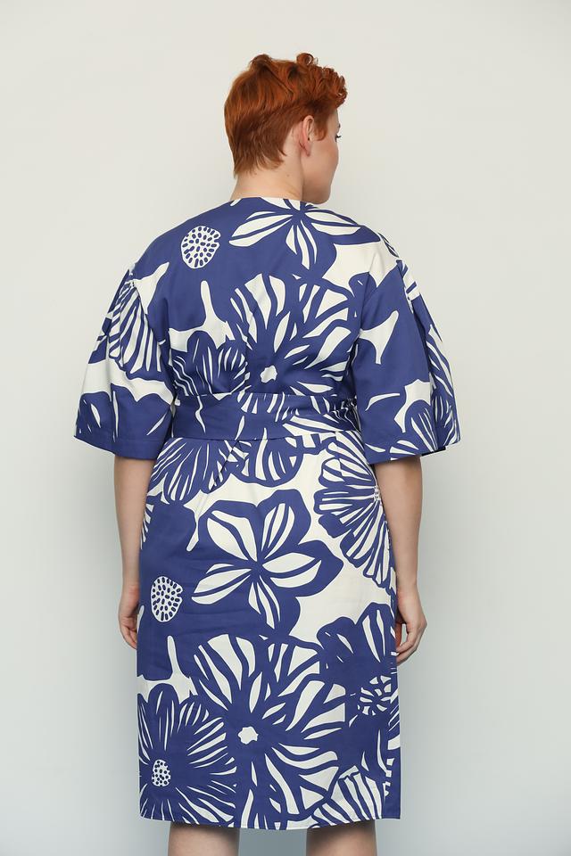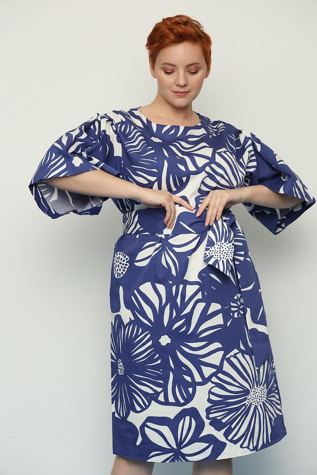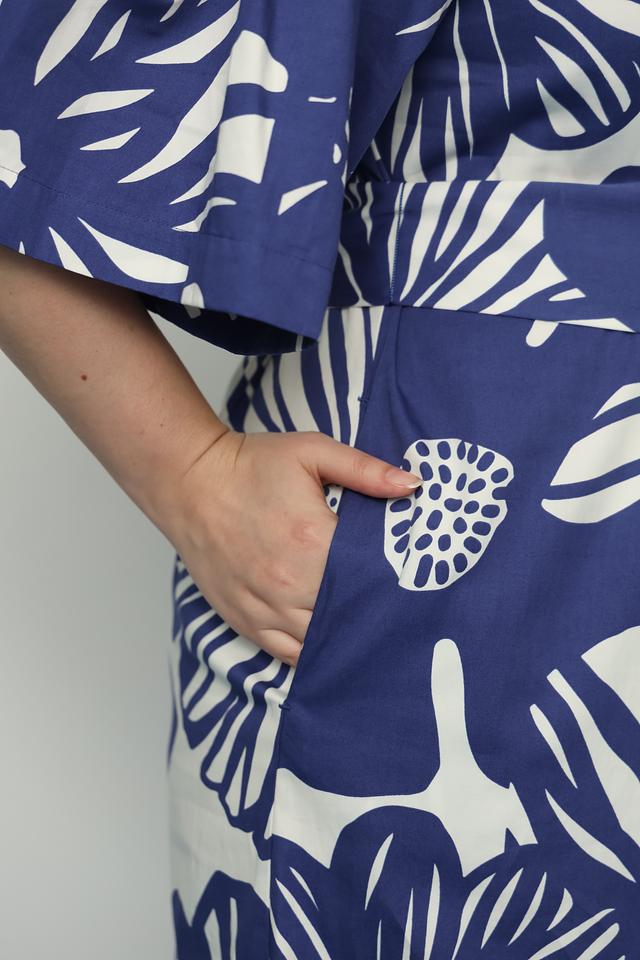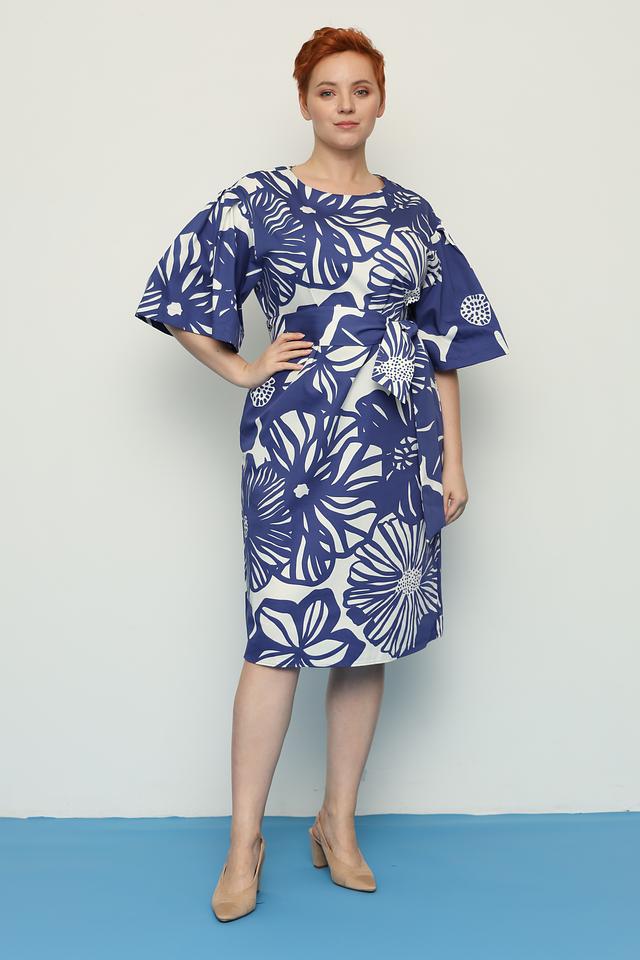 Платье имеет длину миди и слегка расклешенный крой, обеспечивающий свободу движений. Цветочный принт состоит из крупных белых цветов, которые контрастируют с синим фоном, делая образ ярким и запоминающимся. Это платье станет отличным дополнением к вашему гардеробу и подойдёт для различных случаев – от повседневной носки до особых мероприятий.