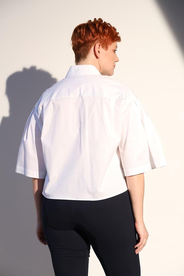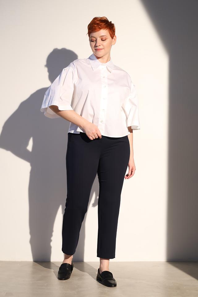Особенностью данной модели являются объёмные рукава-фонарики, которые придают блузке романтичный и женственный вид. Воротник-стойка добавляет изысканности, а застёжка на пуговицы обеспечивает удобство надевания и снятия.