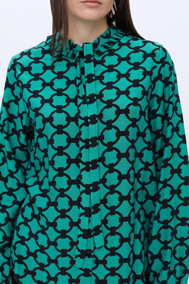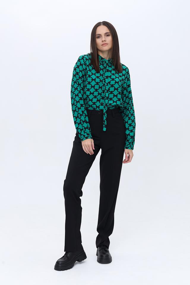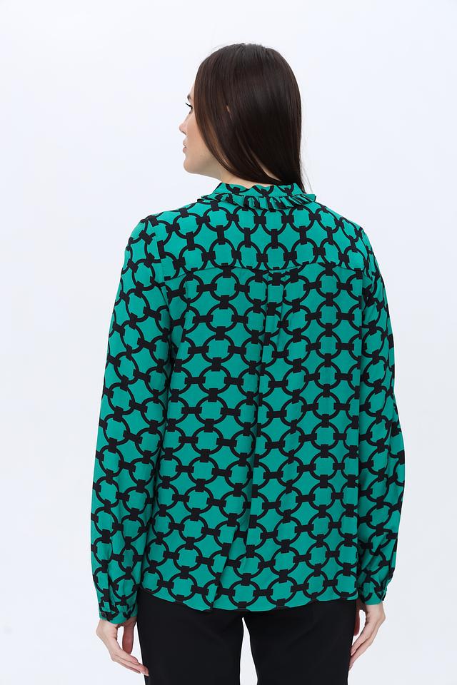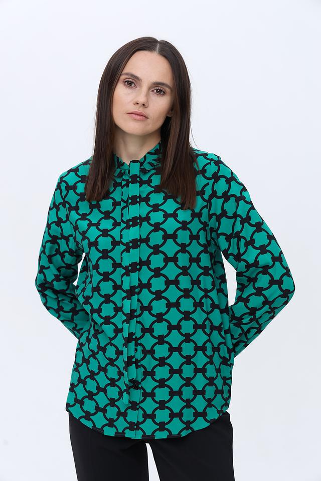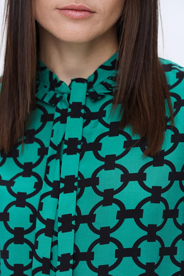 Блуза имеет прямой крой и длинные рукава. Отличительной особенностью является яркий изумрудный цвет и оригинальный геометрический принт, который придаёт ей особый шарм.