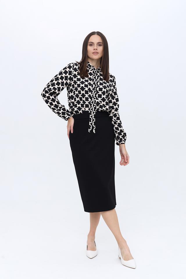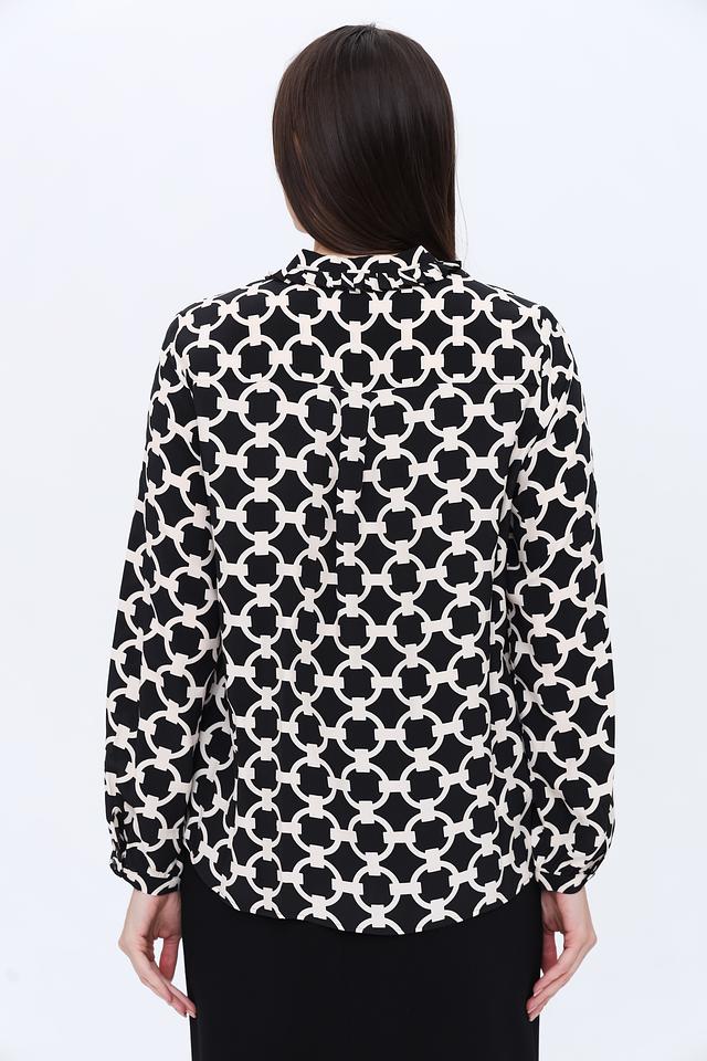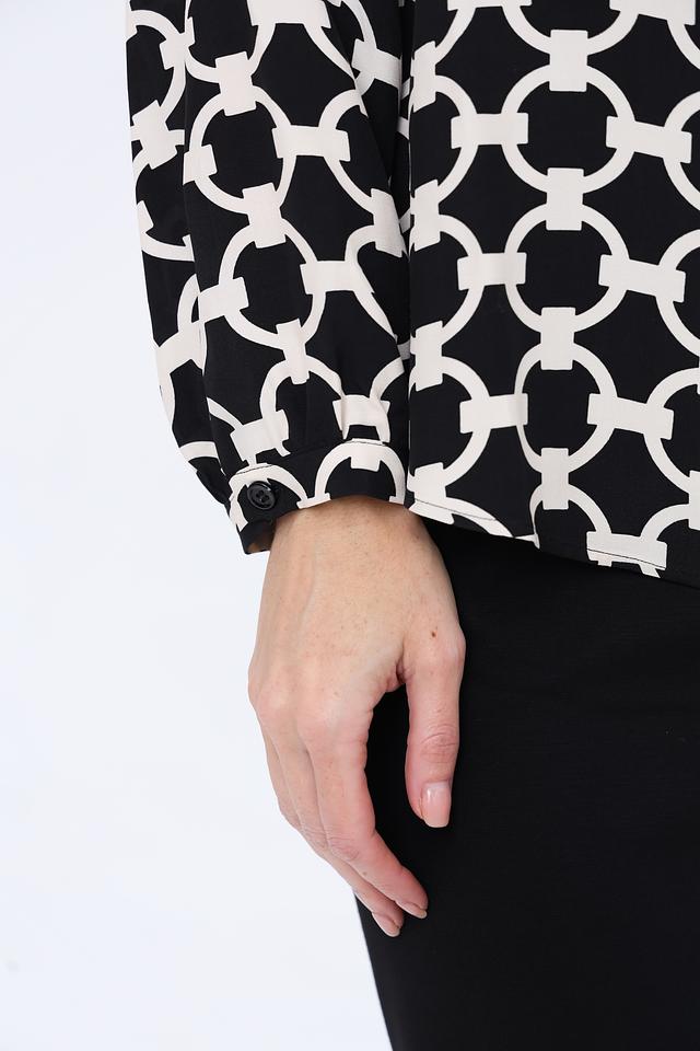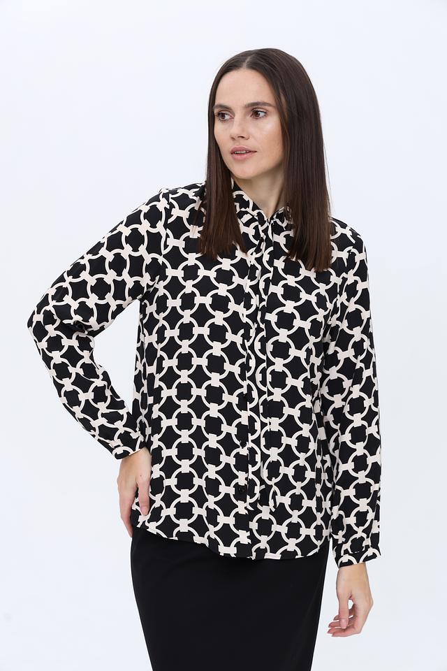 Основной цвет блузы – чёрный, но она выполнена с оригинальным геометрическим принтом в белых тонах. Рисунок представляет собой чередование овальных элементов, создающих динамичный и современный вид.