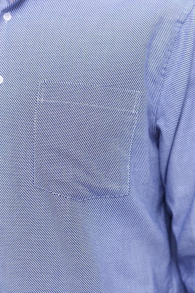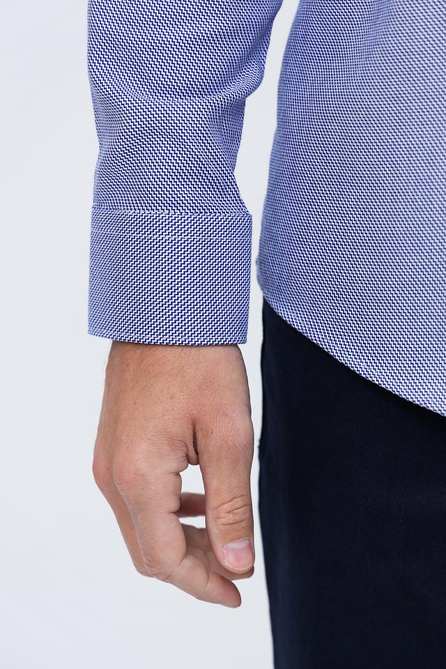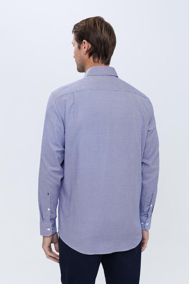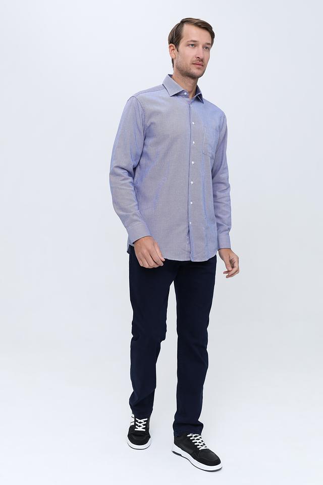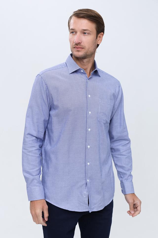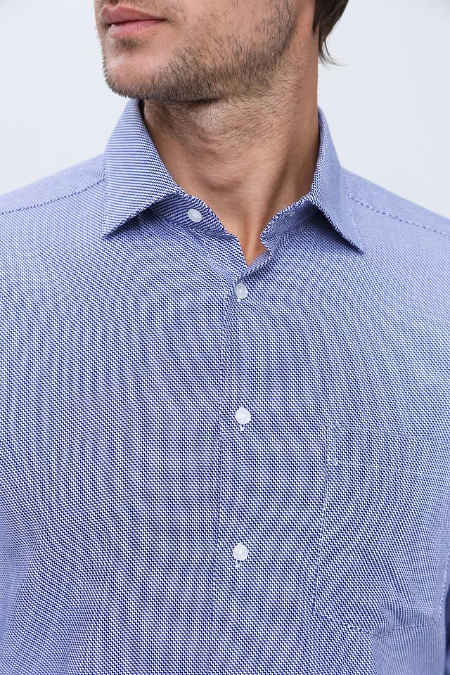 Рубашка имеет классический крой с длинными рукавами и стандартным воротником. Голубой цвет с мелким рисунком придает ей элегантный и универсальный вид, подходящий для различных случаев.