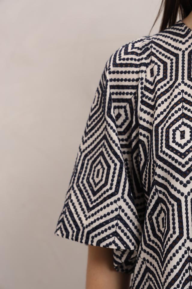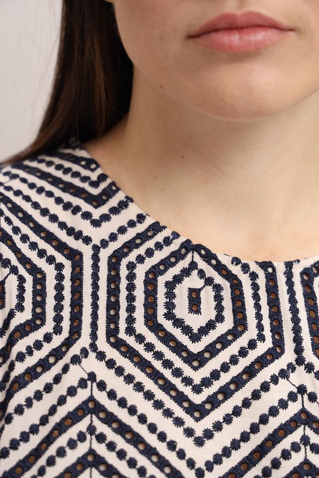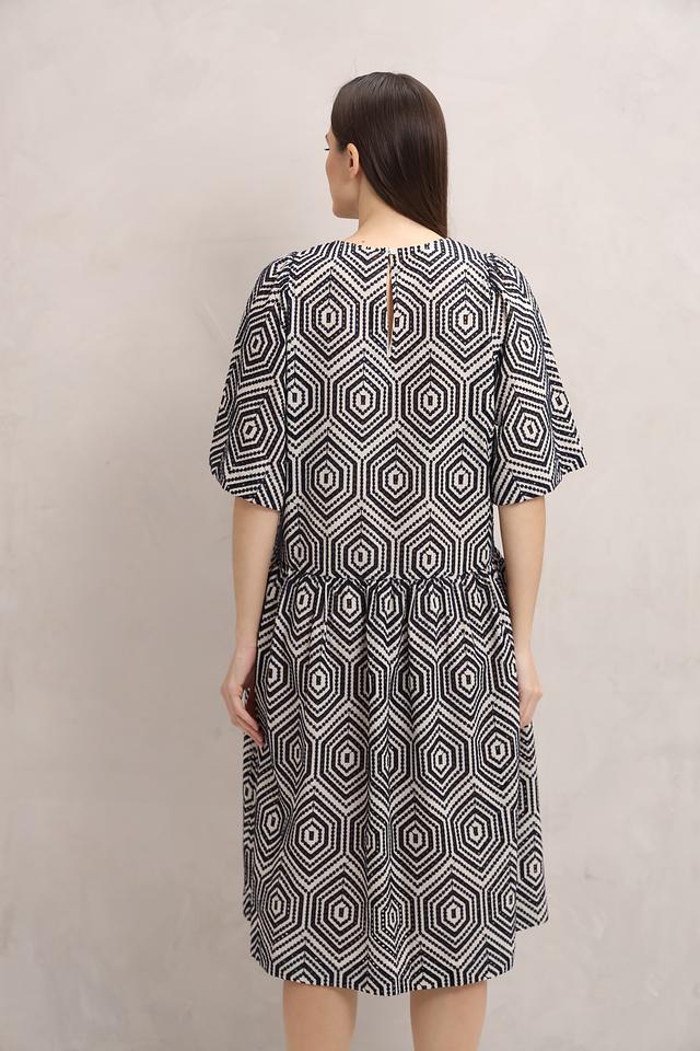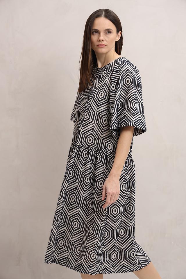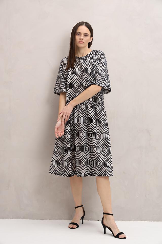 Это платье от Seidensticker – отличный выбор для тех, кто ценит комфорт и стиль. Выполнено в чёрно-белой цветовой гамме с выразительным геометрическим принтом, который делает его уникальным.
