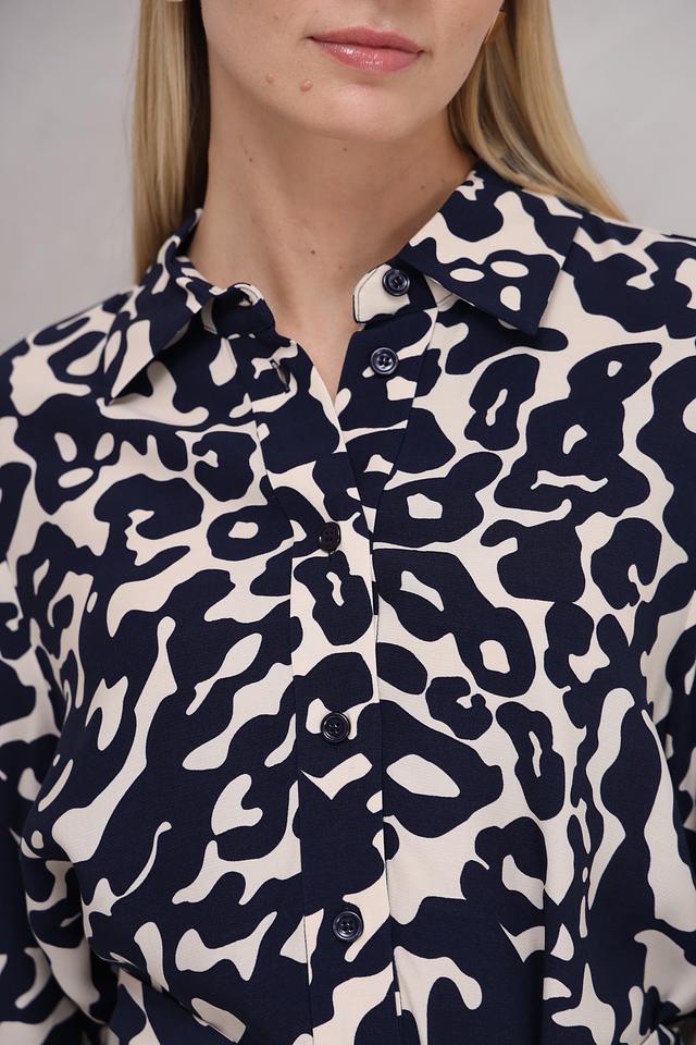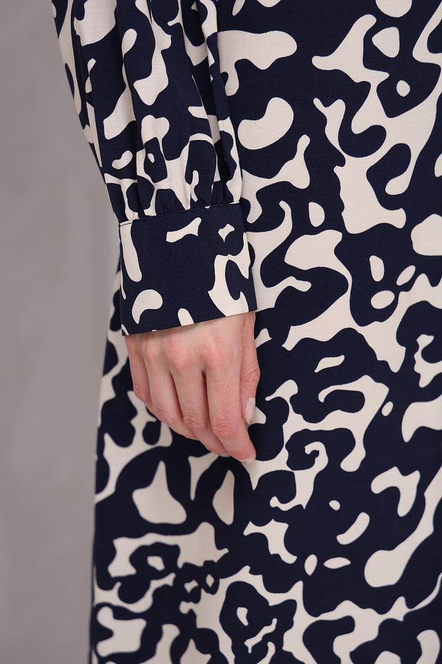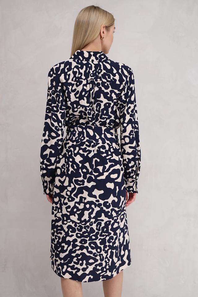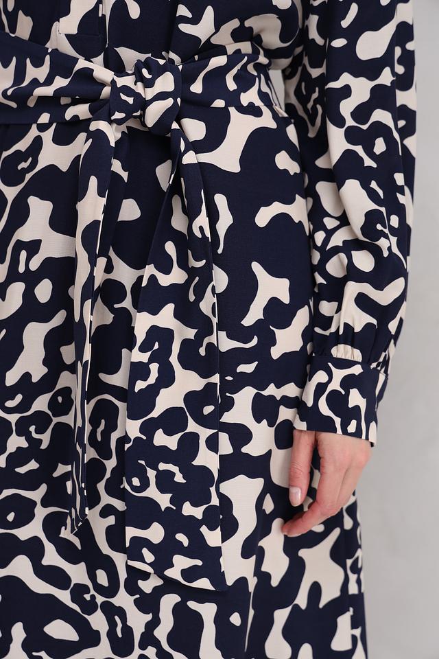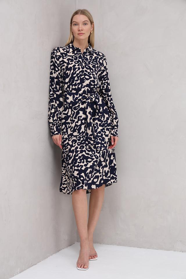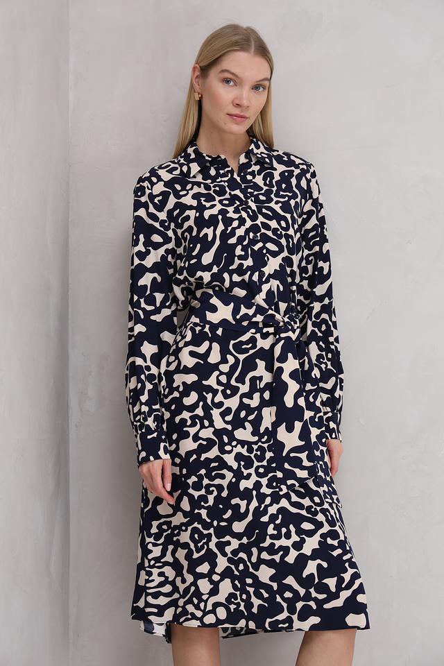 Модель имеет рубашечный крой с воротником и длинными рукавами. Приталенный силуэт подчеркивается завязывающимся поясом, который позволяет регулировать посадку по фигуре. Платье украшено оригинальным принтом в тёмно-синих и кремовых тонах, который придает образу изысканность и неповторимость.