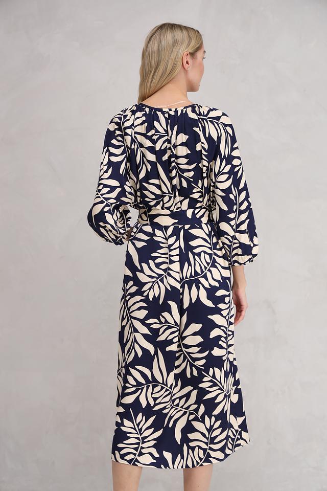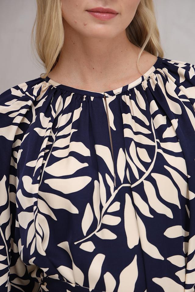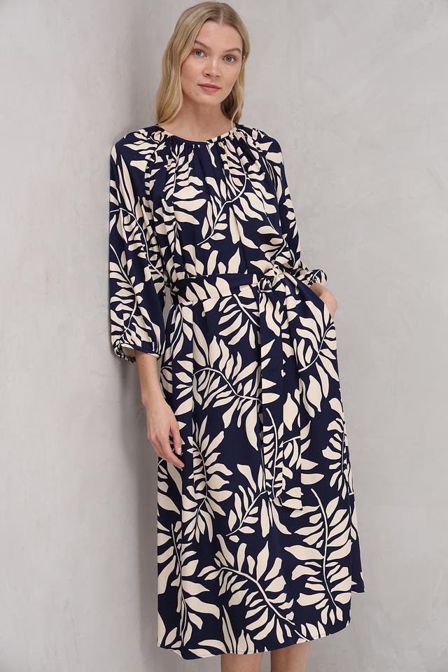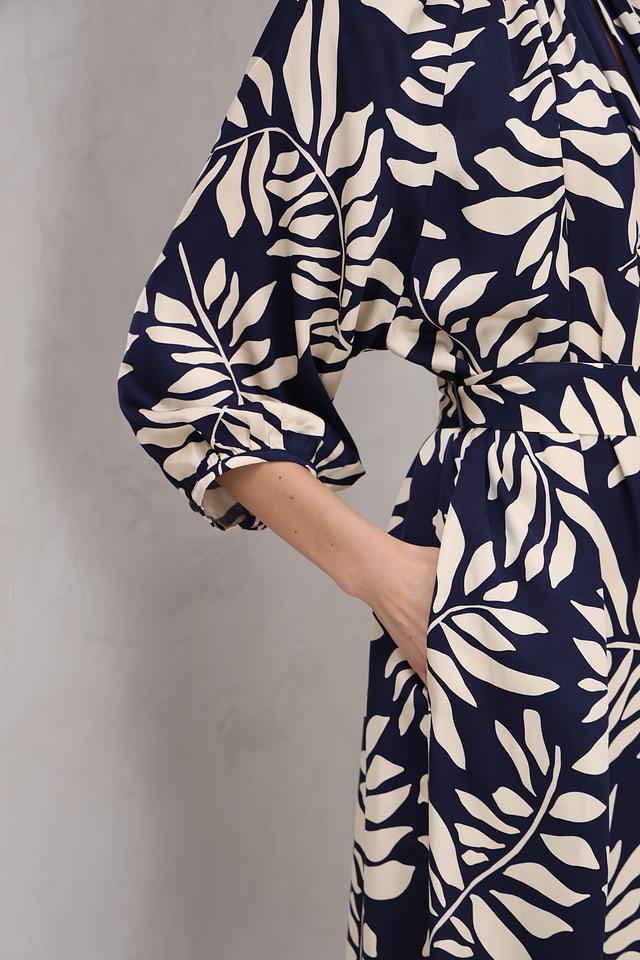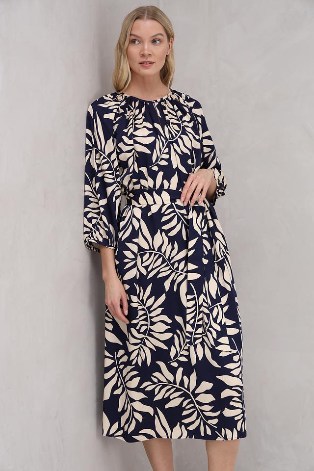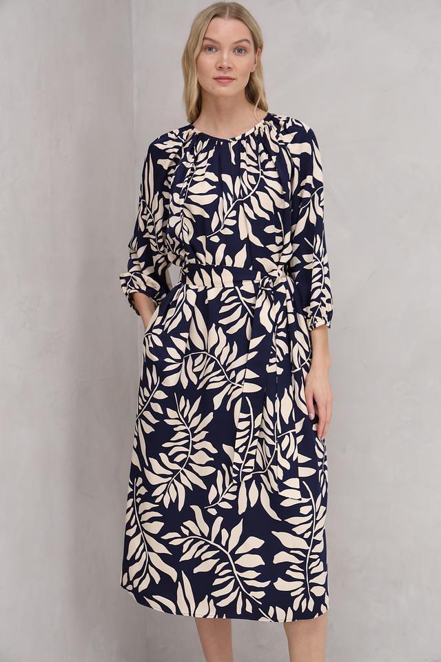 Это элегантное платье от Seidensticker станет прекрасным дополнением к вашему гардеробу. Платье выполнено в насыщенном синем цвете и украшено ярким принтом из белых листьев, создающим свежий и запоминающийся образ.