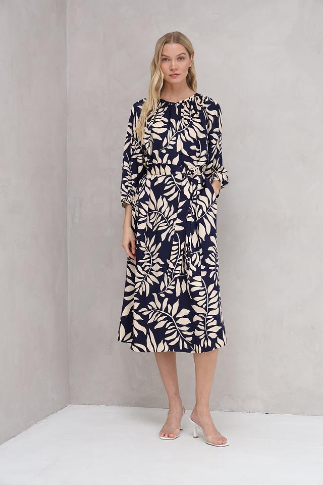 Модель имеет прямой силуэт, длину до колена и рукава 3/4 с небольшими сборками по краю. Платье дополнено поясом, который позволяет подчеркнуть талию и создать более женственный силуэт. V-образный вырез горловины добавляет изящества.