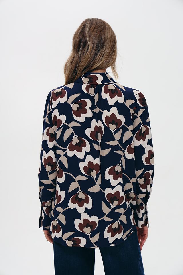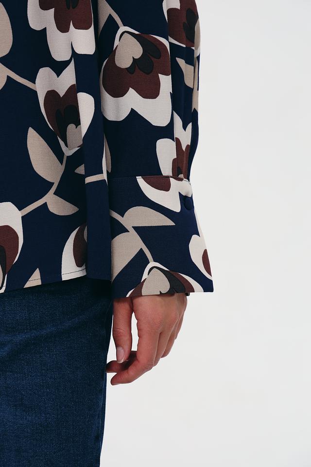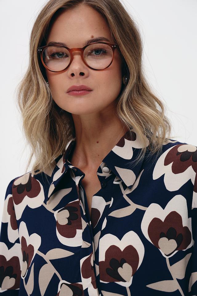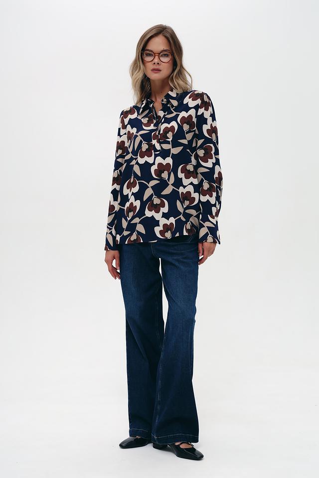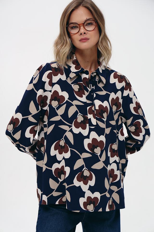 Блуза имеет классический крой с длинными рукавами и отложным воротником. Её украшает яркий и стильный цветочный принт, сочетающий в себе оттенки коричневого, бежевого и темно-синего цветов. Такой рисунок добавит образу женственности и оригинальности.