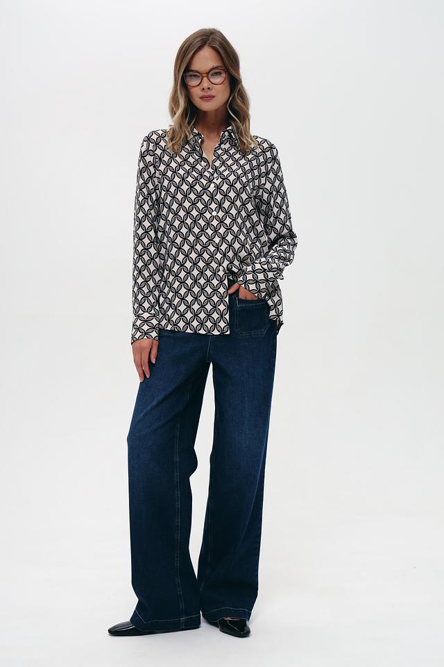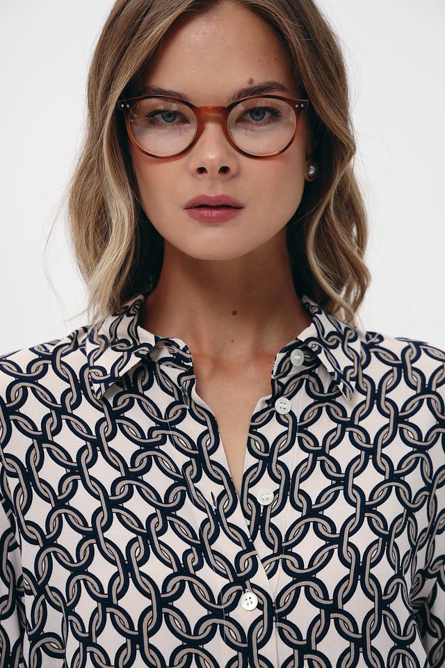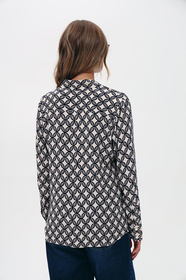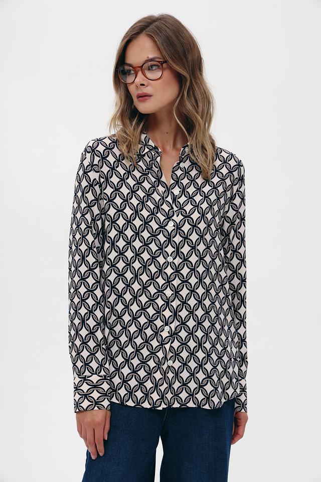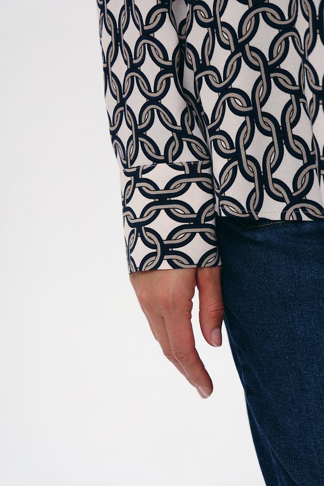 Особенностью данной модели является стильный принт "Цепи", выполненный в сочетании белого и тёмно-синего цветов. Этот узор придает блузе современный и изысканный вид.