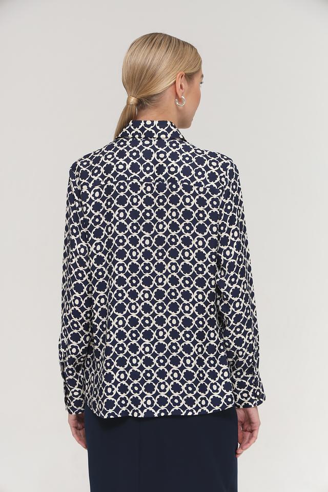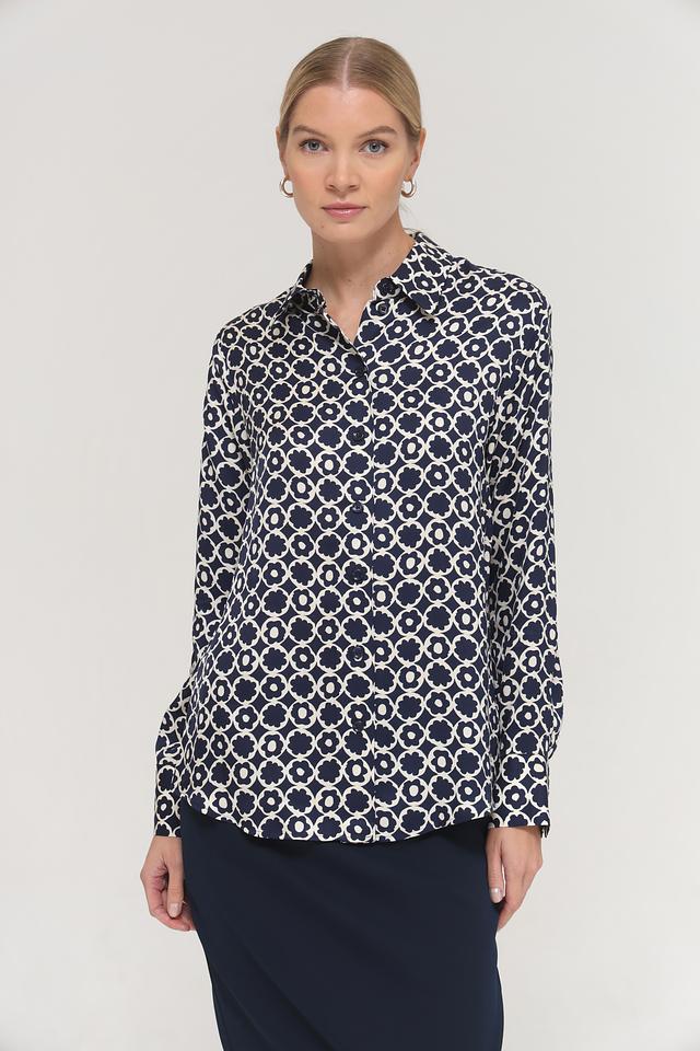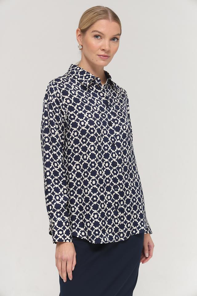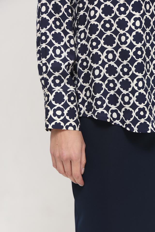 Особенностью данной модели является яркий цветочный принт, выполненный в синих и белых тонах. Он придает блузе свежий и женственный вид.