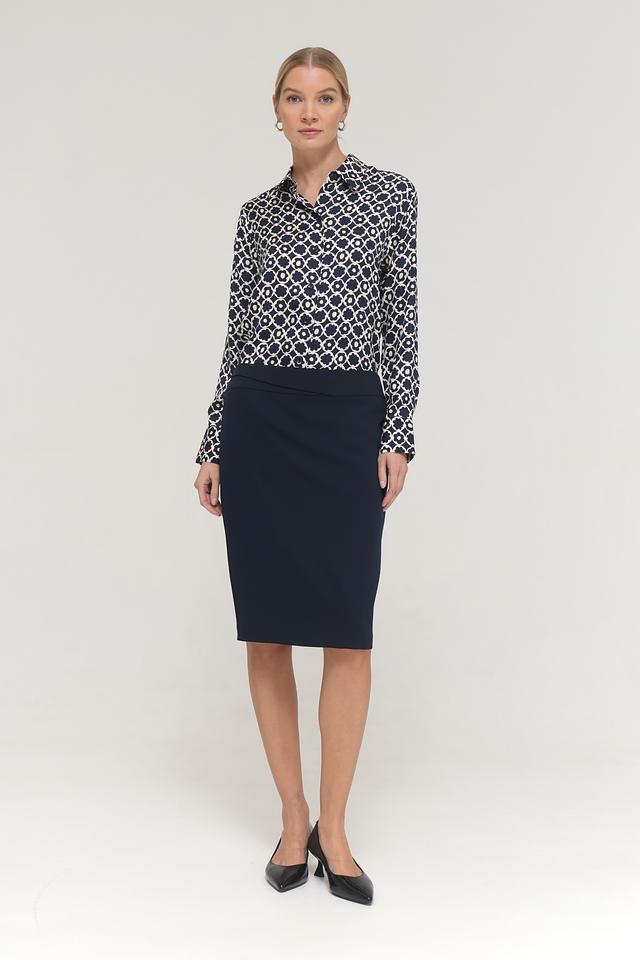 Блуза имеет классический крой с длинными рукавами и отложным воротником. Застежка на пуговицы добавляет элегантности образу.