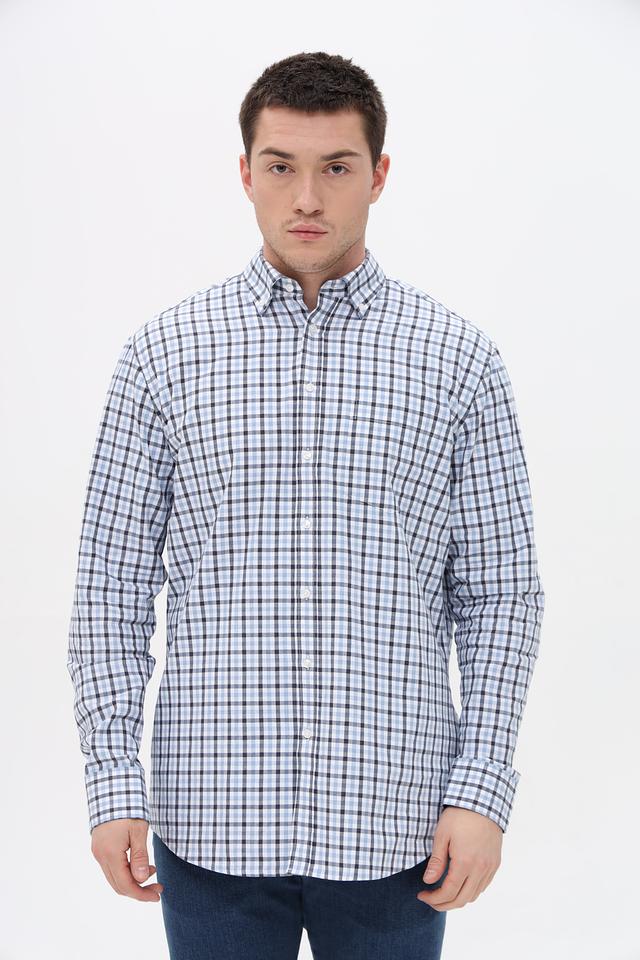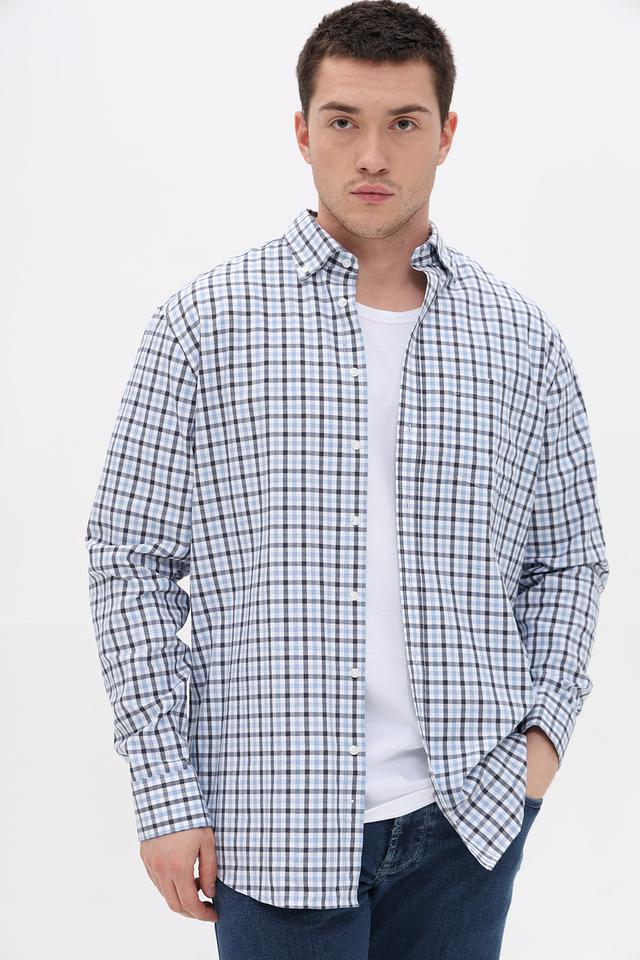 Рубашка имеет классический крой и оформлена в клетку, сочетающую голубой, черный и белый цвета. Это делает ее универсальной и подходящей для различных стилей одежды – от повседневного до более формального.