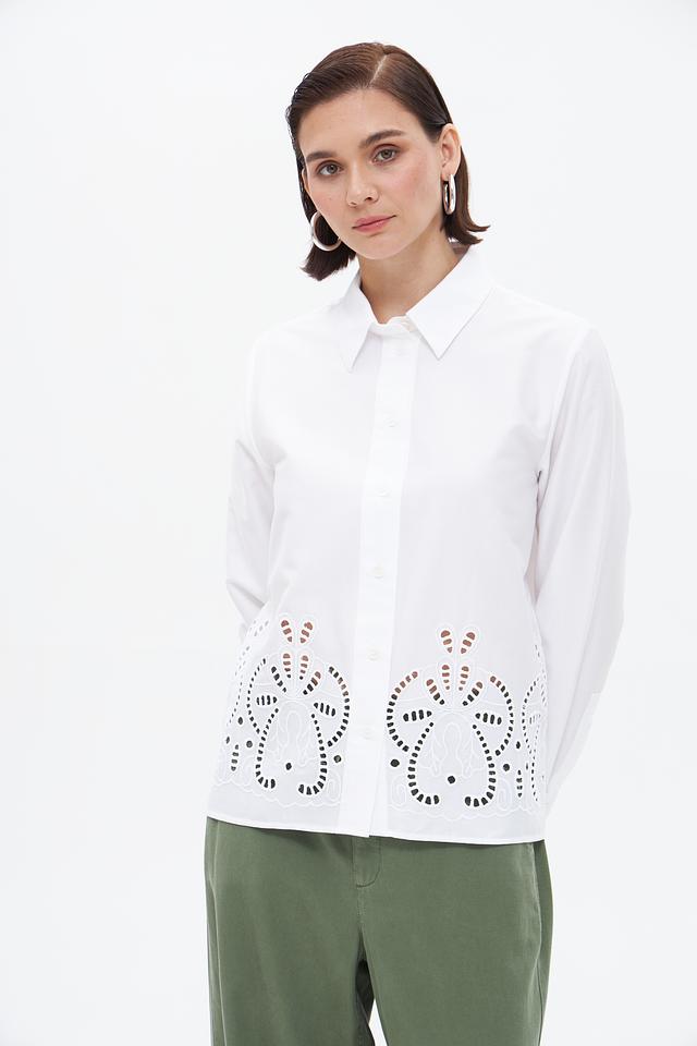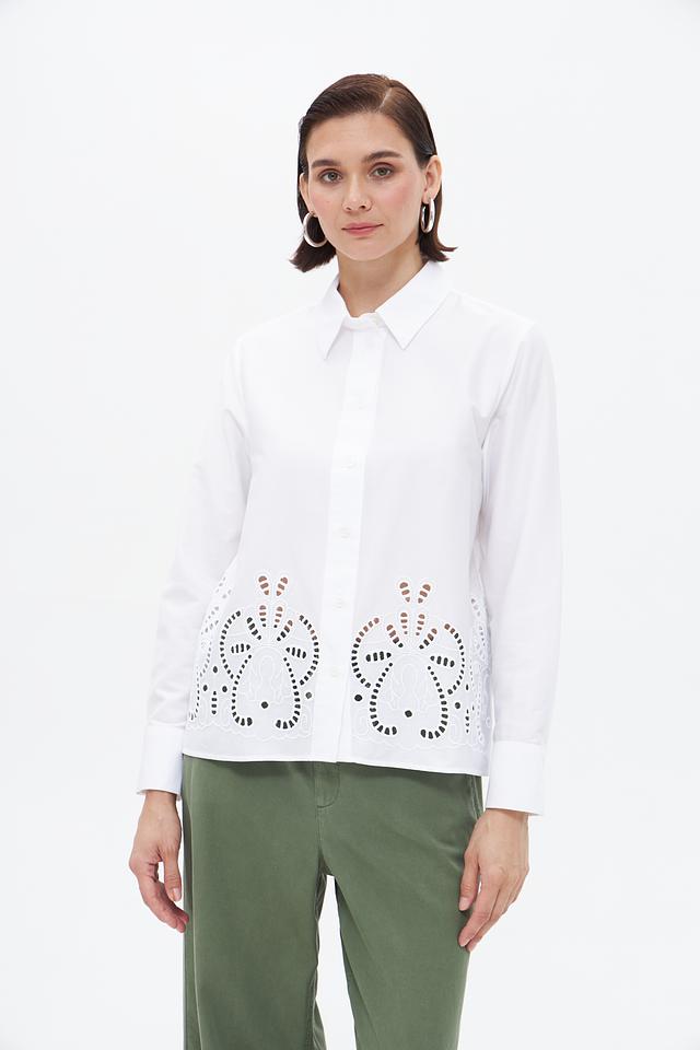 Особенностью данной модели является декоративная вышивка в виде цветочных мотивов на нагруди, придающая ей изысканность и женственность. Блузка застегивается на пуговицы по всей длине. Она идеально подойдет для создания как деловых, так и повседневных образов.