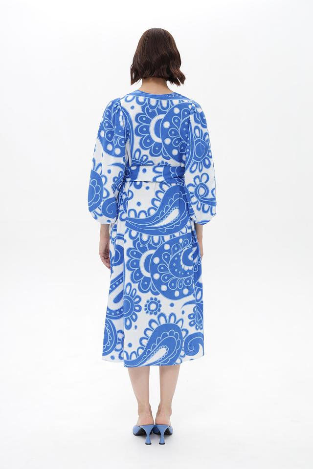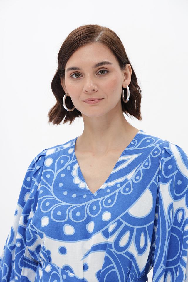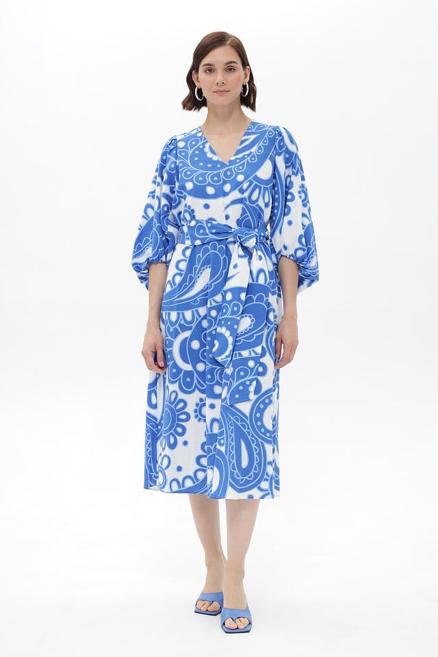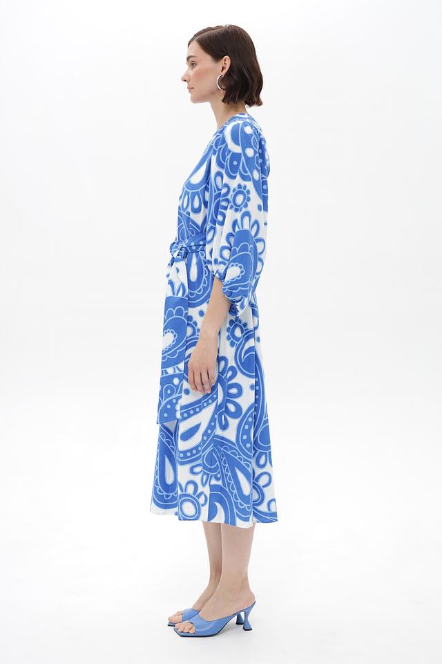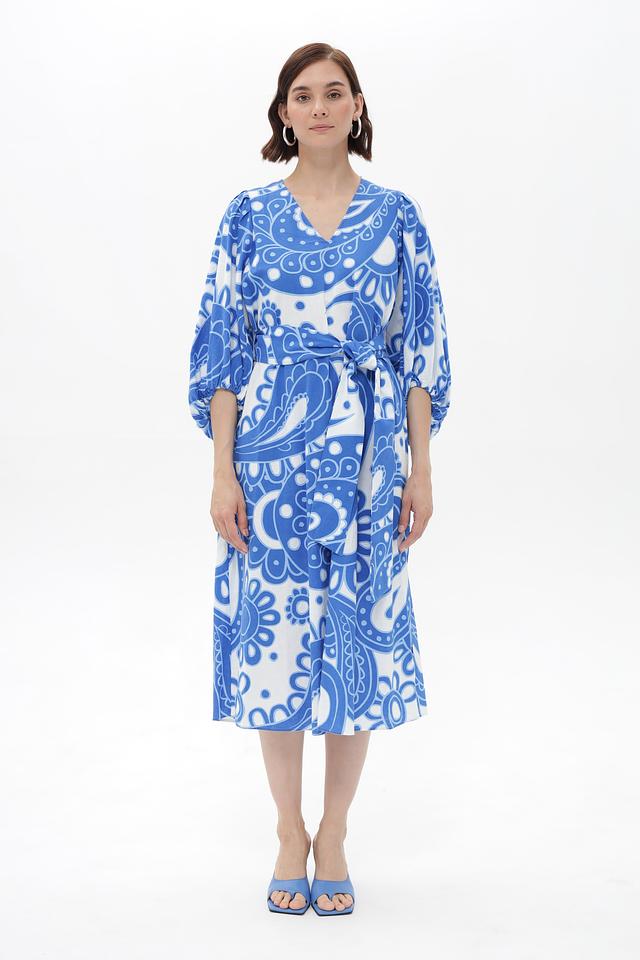 Платье от Seidensticker, выполненное в голубой цветовой гамме с оригинальным принтом пейсли. Модель имеет V-образный вырез и рукава длиной 3/4 с манжетами, придающие образу элегантность.
