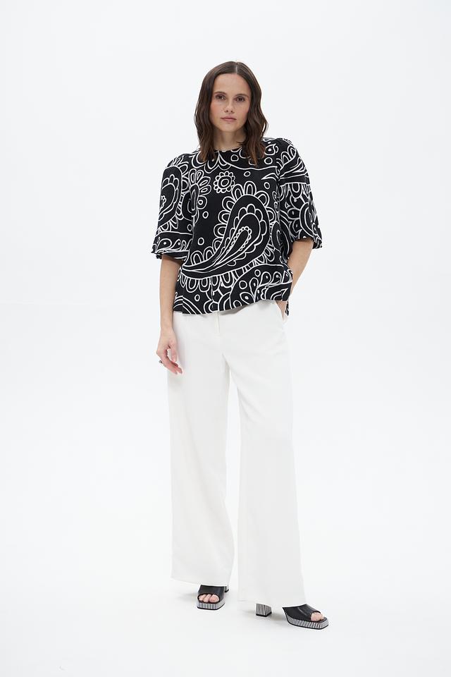 Блузка имеет свободный крой и короткие рукава, что обеспечивает комфорт в жаркую погоду. Округлый вырез горловины придает образу элегантность.