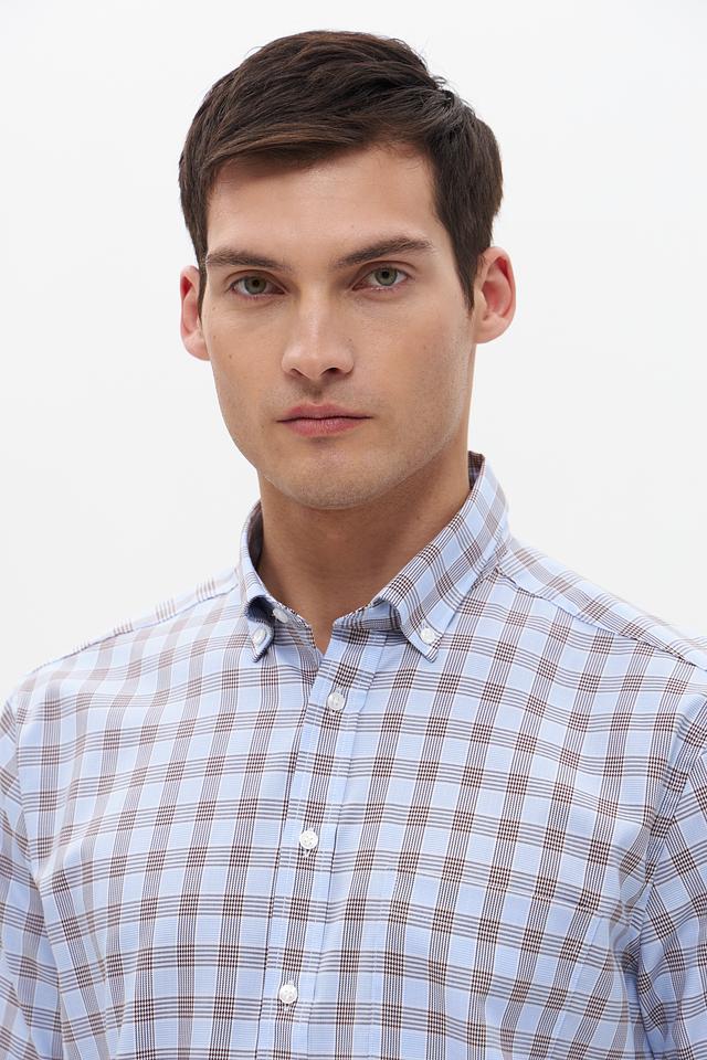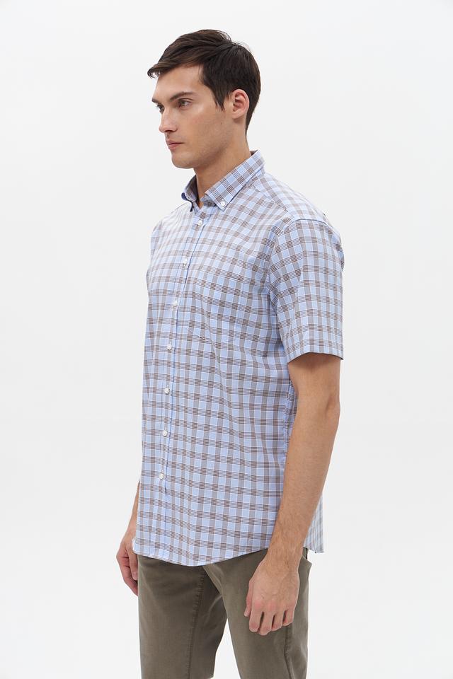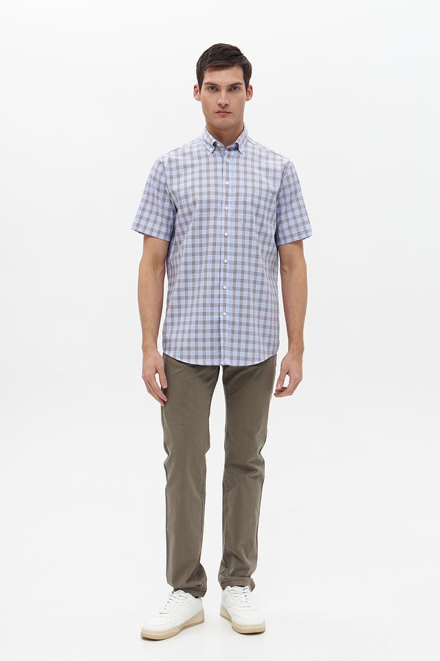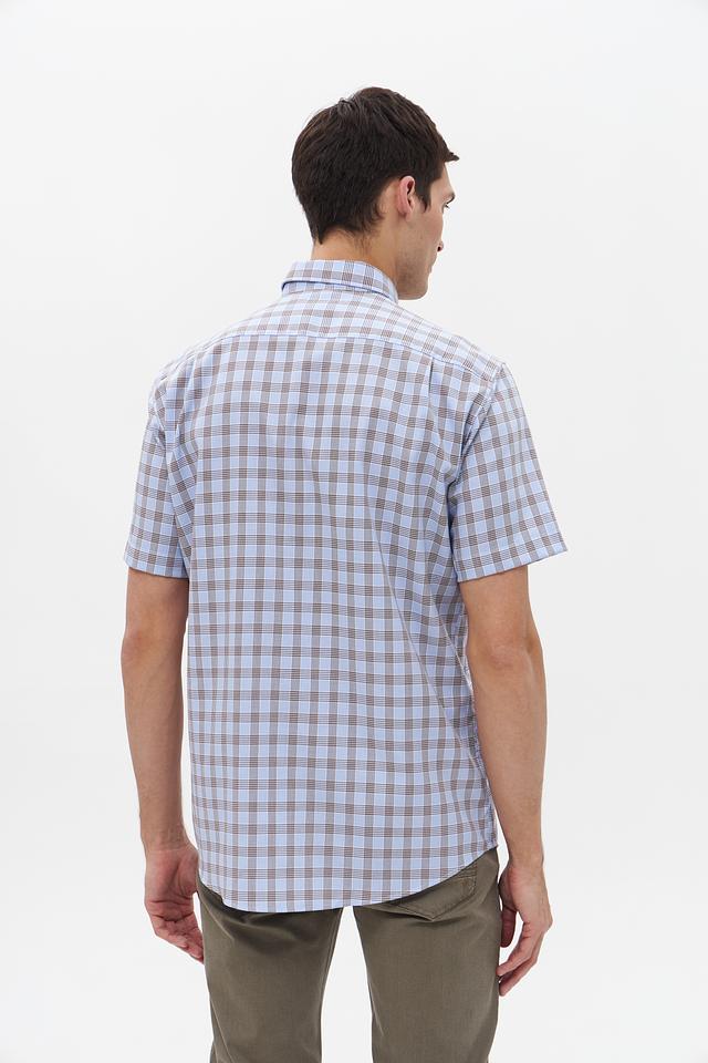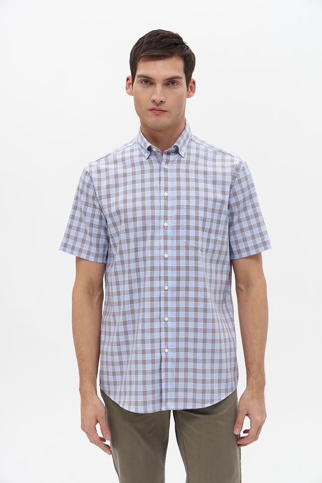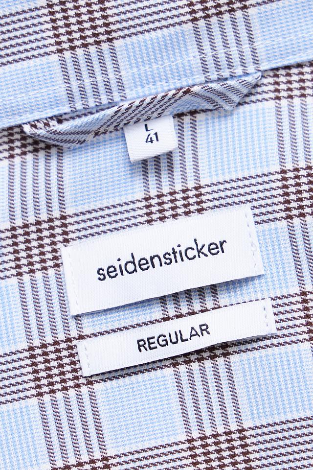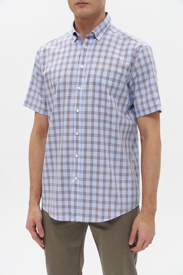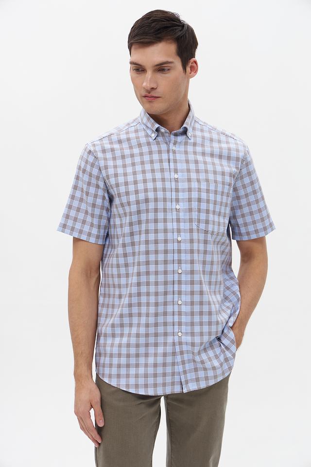 Мужская рубашка с коротким рукавом от бренда Seidensticker. Выполнена в голубой цветовой гамме с классическим клетчатым рисунком, сочетающим голубой и коричневый оттенки.