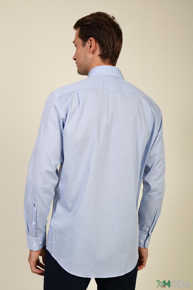 Рубашка имеет классический крой, который подчеркивает фигуру, не сковывая движений. Воротник рубашки выполнен в стандартном стиле, подходящем для ношения с галстуком или без него. Застежка на пуговицах обеспечивает надежную фиксацию. На левой стороне груди расположен накладной карман.