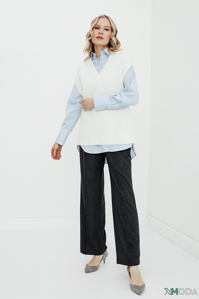 Состав ткани: 72% полиэстер, 22% вискоза, 6% эластан. Этот микс материалов обеспечивает приятные тактильные ощущения, хорошую драпировку и устойчивость к сминанию. Брюки идеально подходят для повседневной носки и особых случаев.