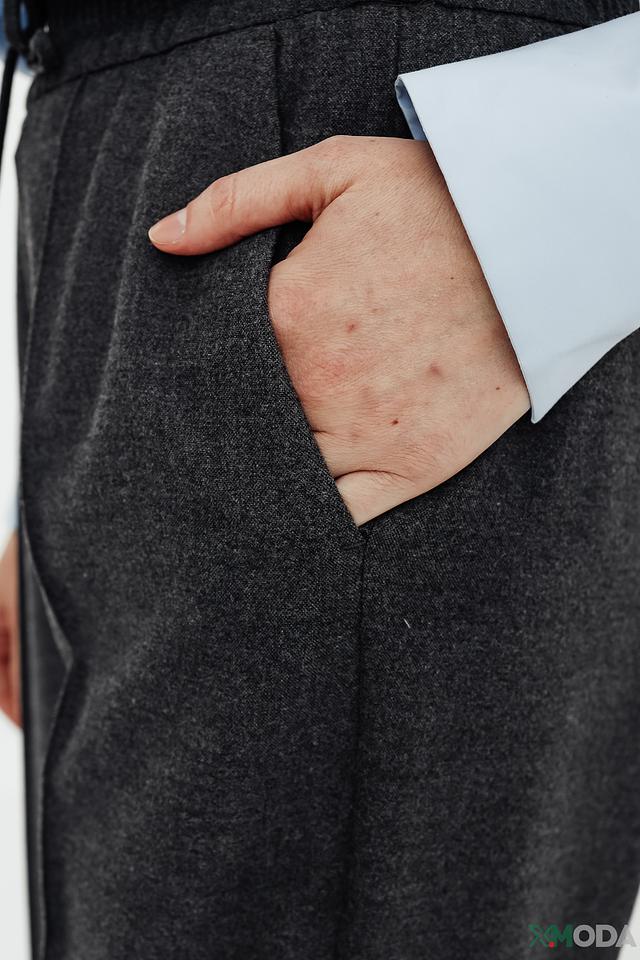 Брюки имеют завышенную талию, которая визуально удлиняет ноги и подчеркивает фигуру. Эластичная вставка в поясе обеспечивает комфортную посадку и свободу движений. Боковые карманы добавляют функциональности и практичности.