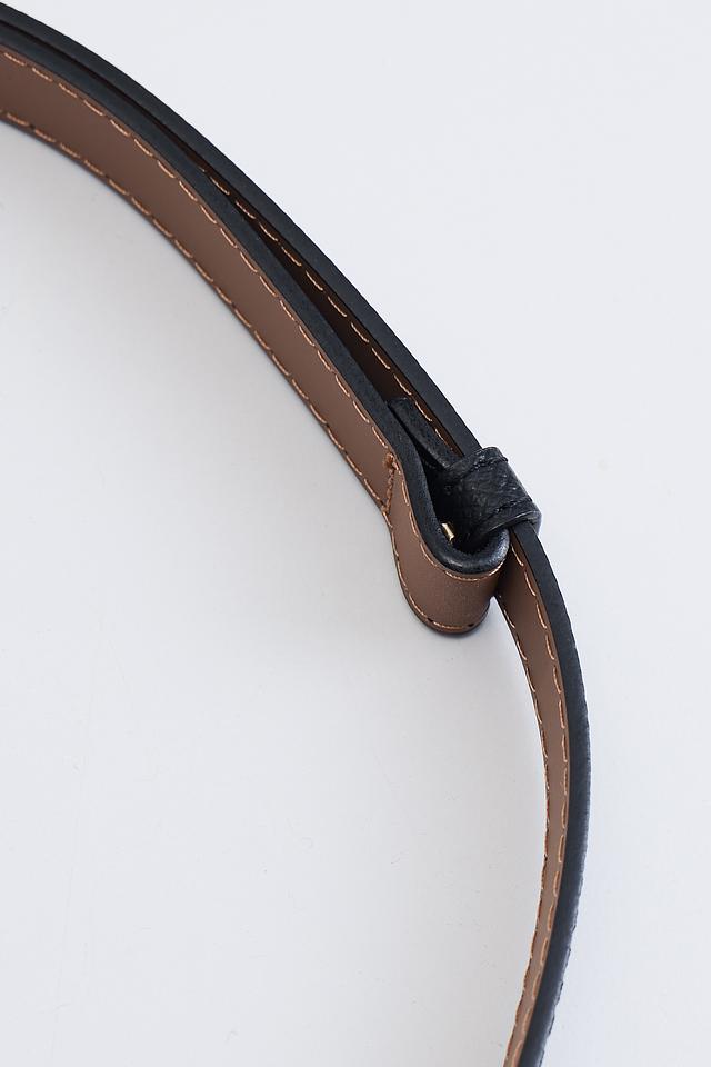 Ремень имеет классический чёрный цвет и лаконичный дизайн. Акцентным элементом является металлическая пряжка, которая придает аксессуару изысканность и современный вид. Внутренняя сторона ремня выполнена из коричневой кожи.