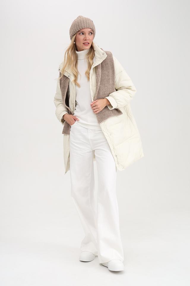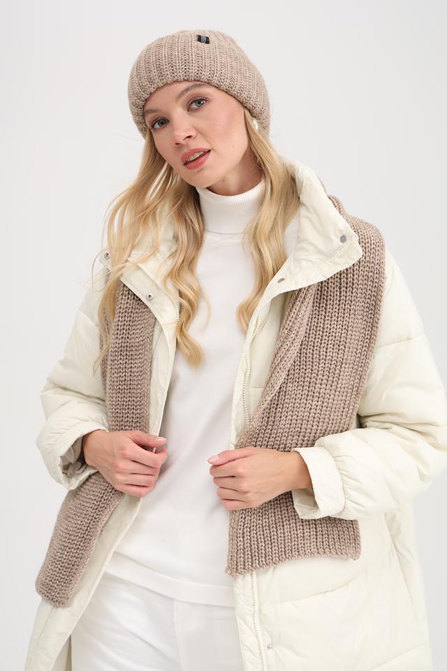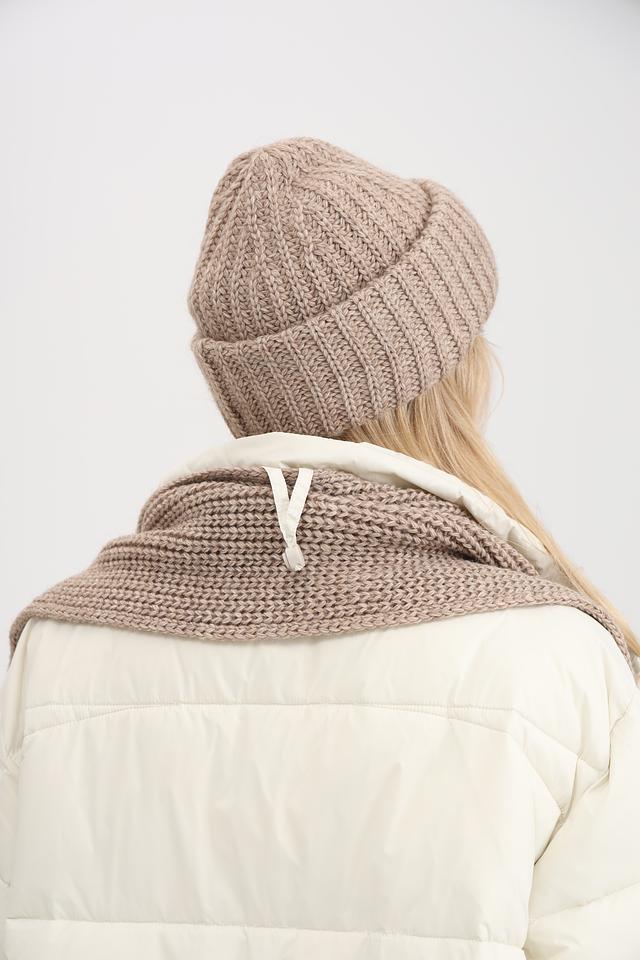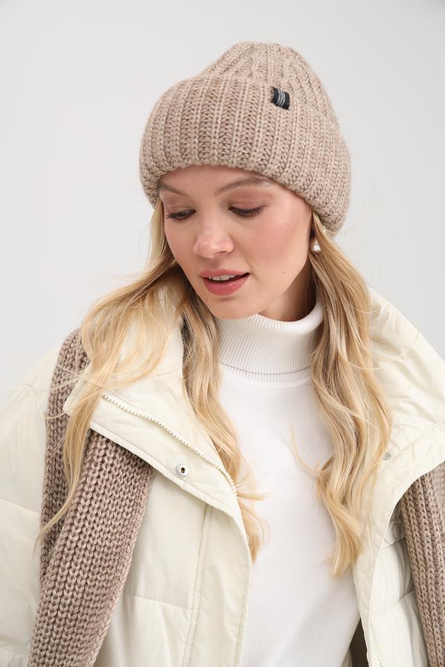 Шапка имеет классический дизайн и нейтральный бежевый цвет, который легко сочетается с различными видами верхней одежды и повседневной одеждой. Вязаная текстура придает шапке уютный и стильный вид.