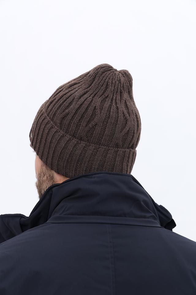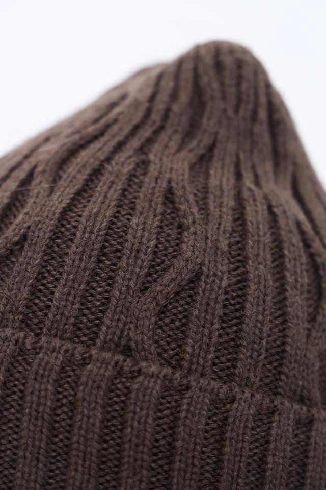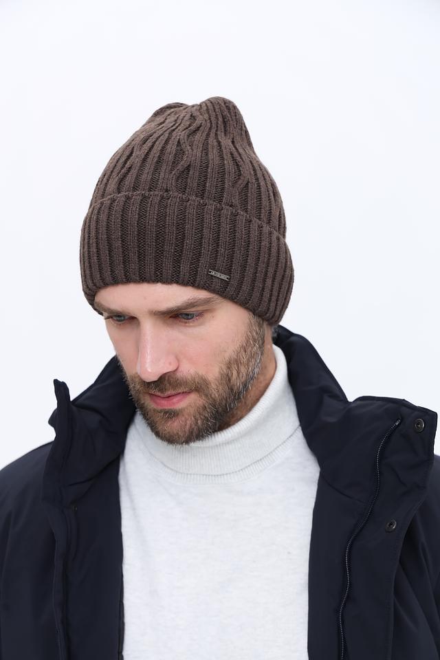 Шапка имеет классический дизайн и насыщенный коричневый цвет. Текстурный узор вязки добавляет шапке объём и визуальный интерес. Небольшой металлический логотип бренда деликатно размещён спереди.