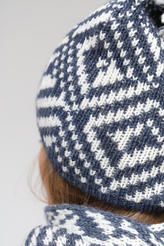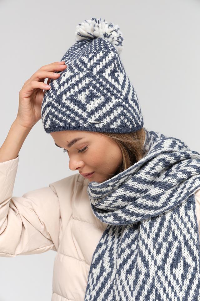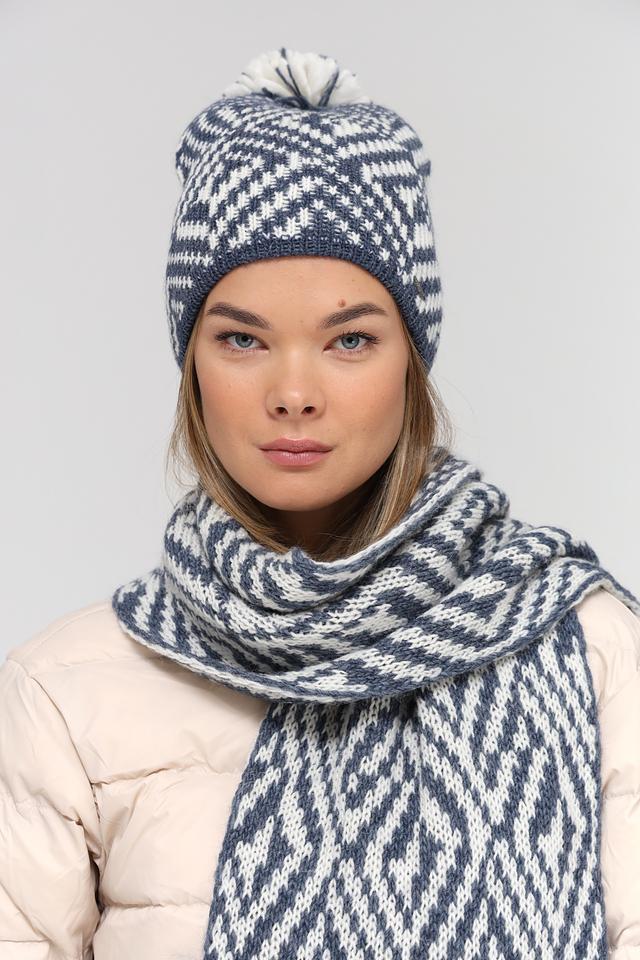 Стильная шапка Marhatter синего цвета с белым геометрическим узором и помпоном. Изготовлена из шерсти, акрила и альпаки для тепла и комфорта. Состав: шерсть 47%, акрил 45%, альпака 8%