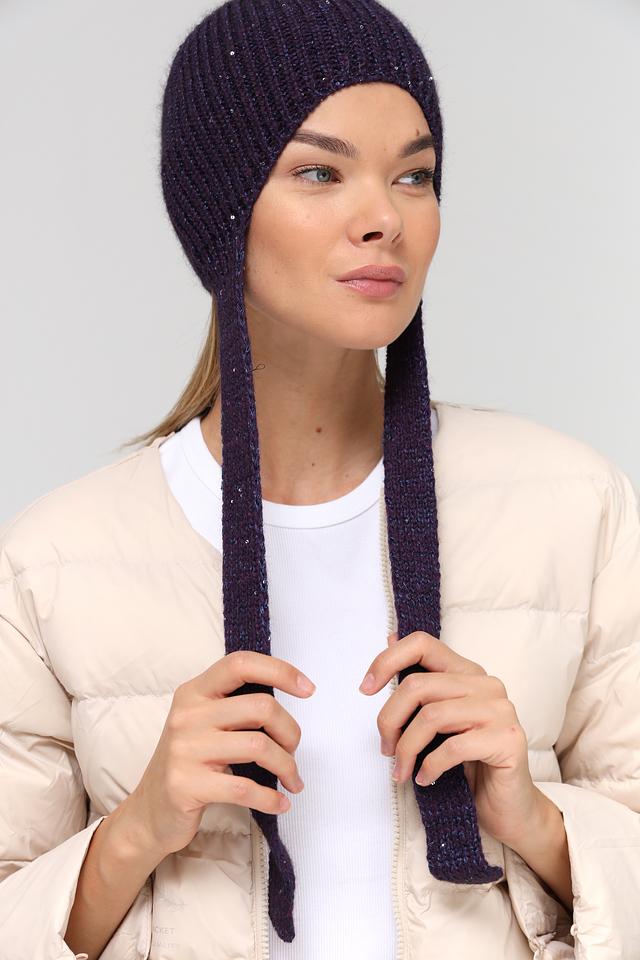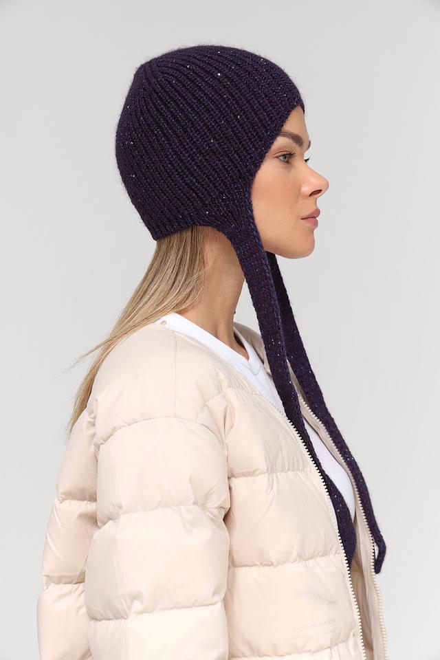 Шапка имеет классическую форму и насыщенный фиолетовый цвет. Оригинальным элементом дизайна являются две длинные косы, свисающие сзади, которые добавляют образу динамичности и индивидуальности.