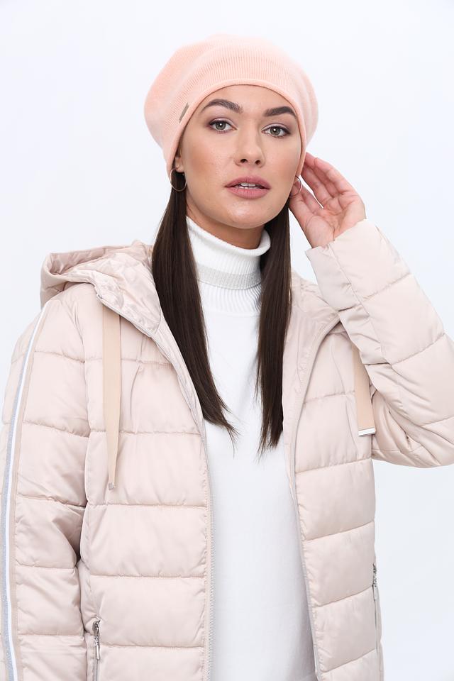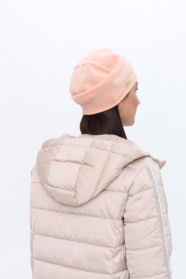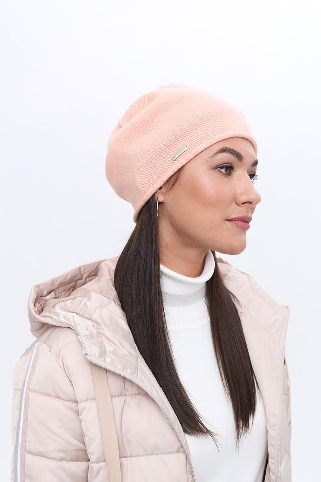 Шапка имеет классическую форму и нежно-розовый цвет, который легко сочетается с различными оттенками в вашем гардеробе. Минималистичный дизайн дополнен небольшим металлическим логотипом бренда, который придает шапке элегантный вид.