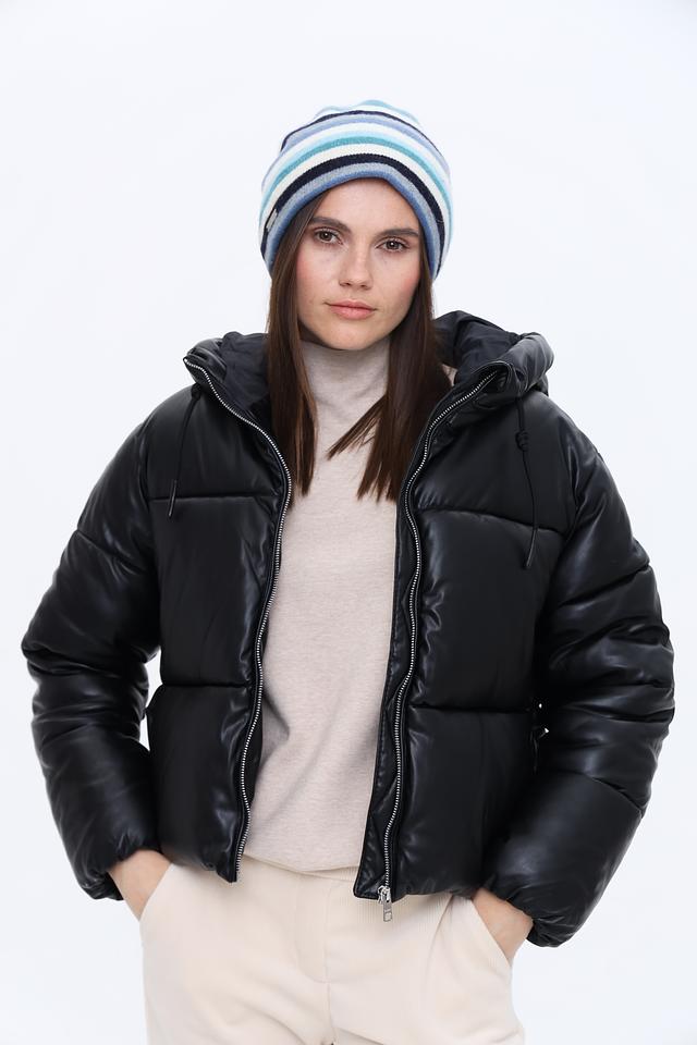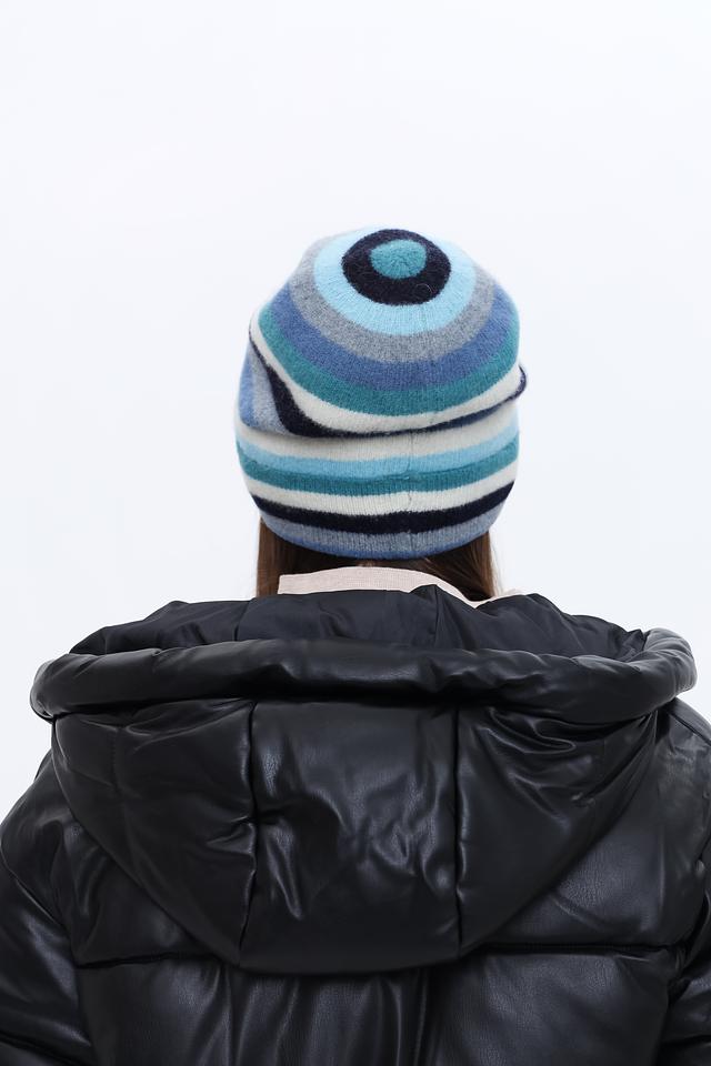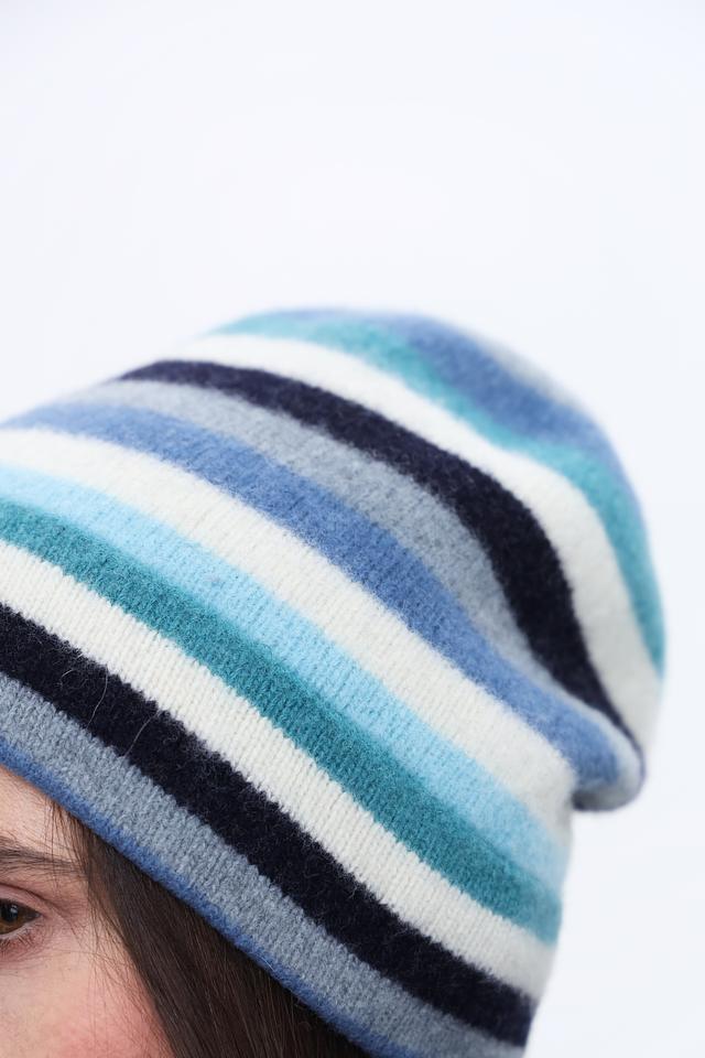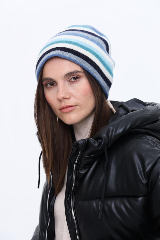 Дизайн шапки выполнен в виде широких горизонтальных полос, сочетающих в себе оттенки голубого, серого и белого. Такая цветовая гамма делает шапку универсальной и легко сочетаемой с различными видами верхней одежды.