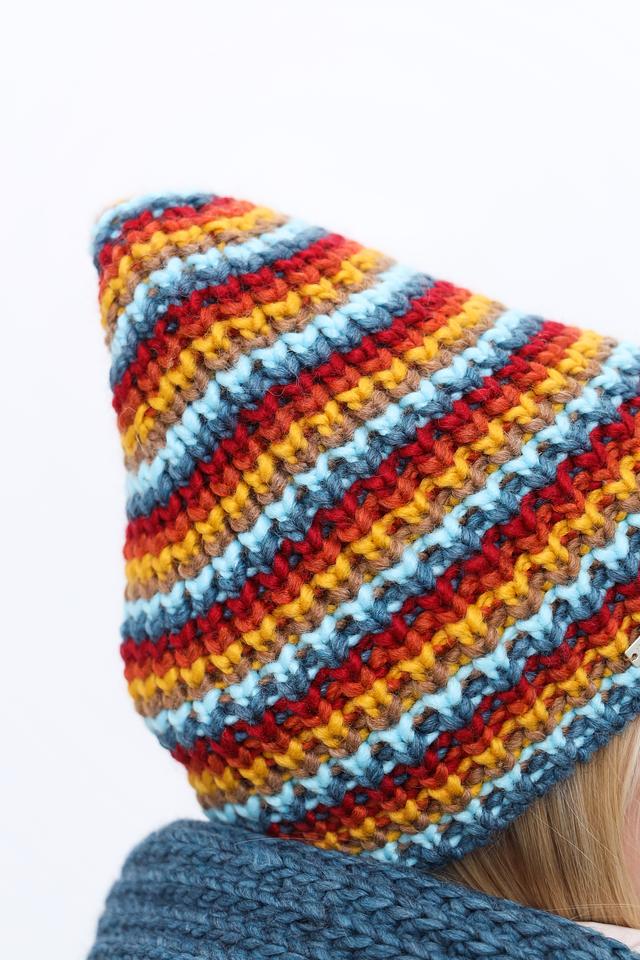 Шапка имеет оригинальный полосатый дизайн, сочетающий в себе несколько ярких цветов: оранжевый, красный, синий и жёлтый. Благодаря этому, она легко сочетается с различной верхней одеждой и аксессуарами.
