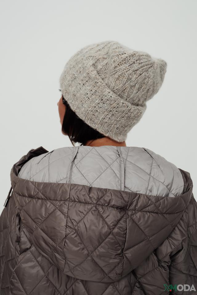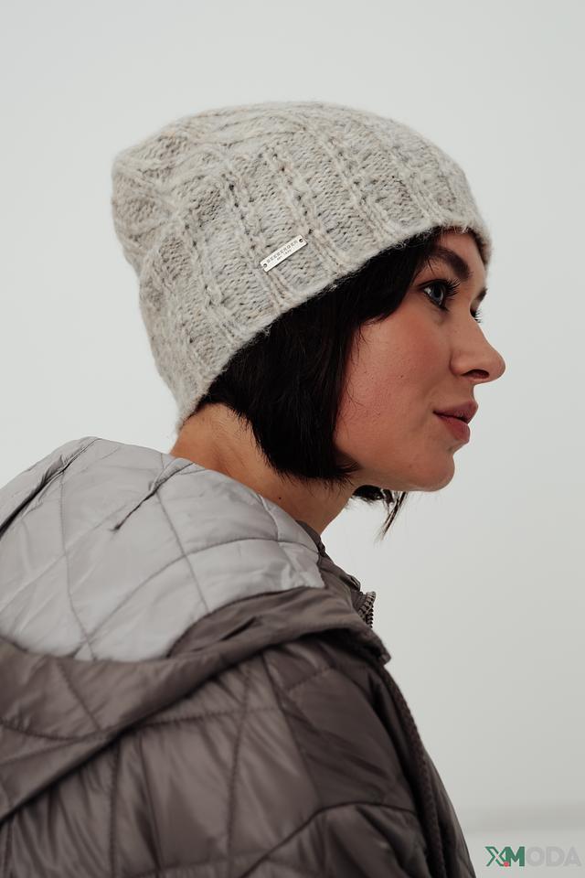 Шапка имеет классический дизайн и приятный серый цвет, который легко сочетается с различными видами верхней одежды. Вязаный узор добавляет текстуру и визуальный интерес. Небольшой логотип бренда аккуратно размещен на лицевой стороне.