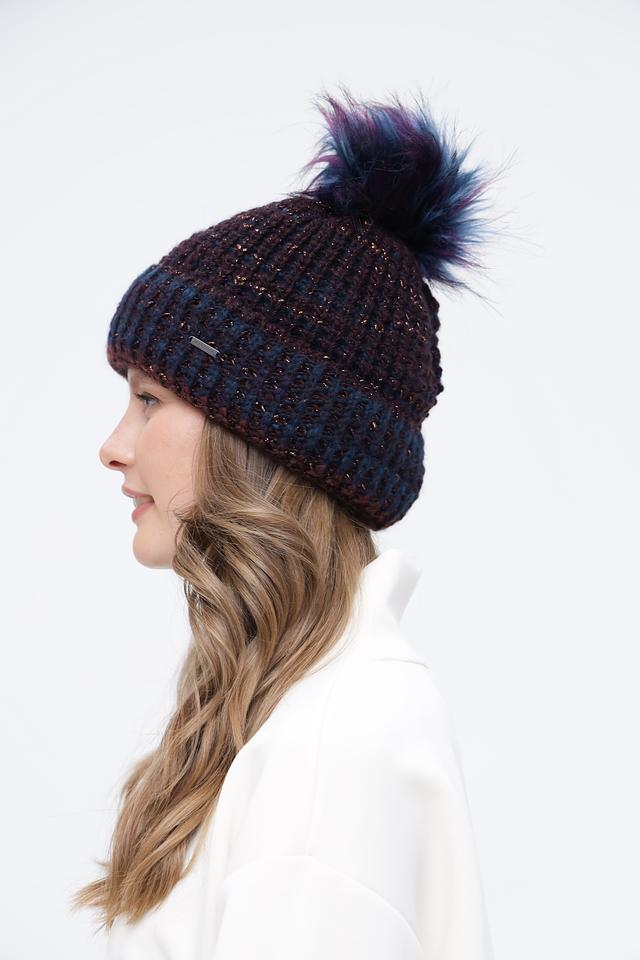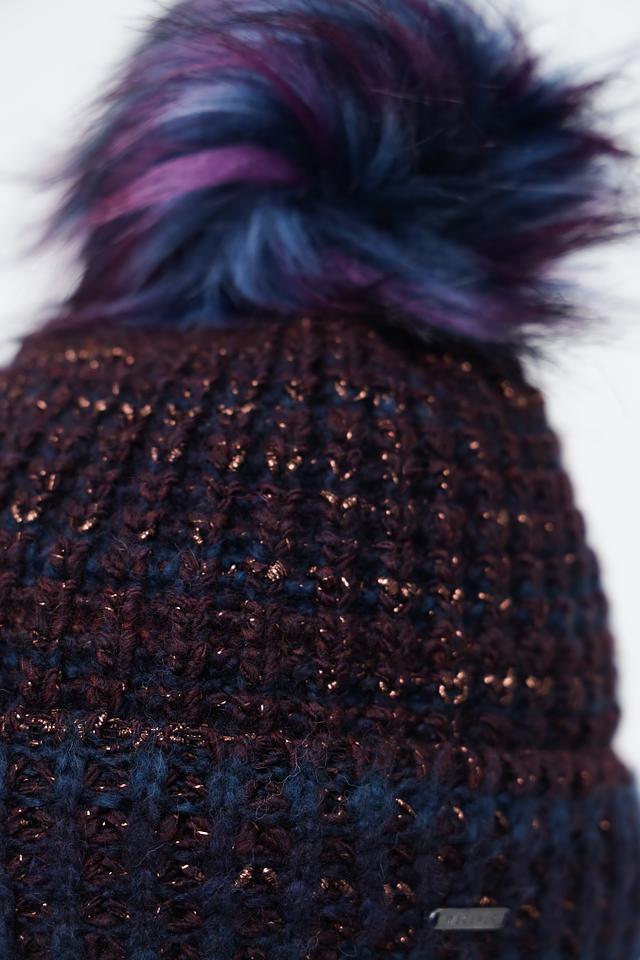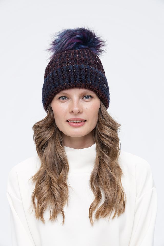 Шапка имеет классический дизайн с большим помпоном, который придает ей игривый и молодежный вид. Бордовый цвет с вкраплениями синего и золотистого люрекса делает эту шапку особенно привлекательной и оригинальной.