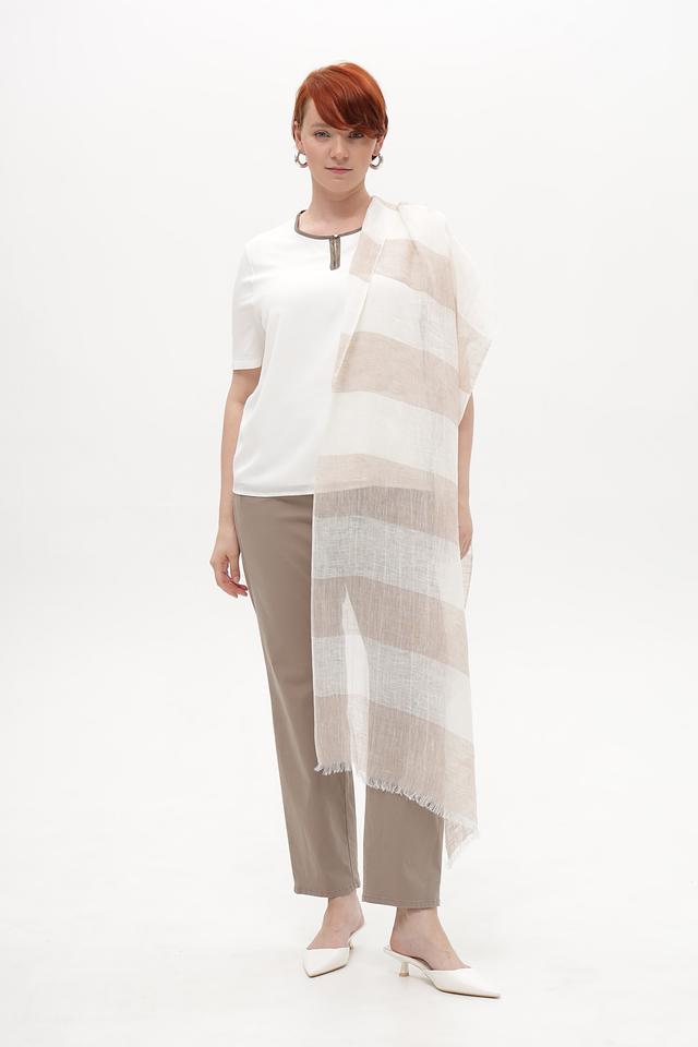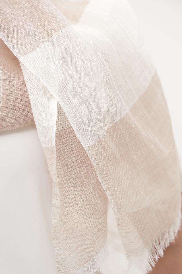 Шарф имеет лёгкую текстуру и украшен полосками в бежевых и кремовых тонах. Бахрома по краям добавляет шарфу лёгкости и непринуждённости.