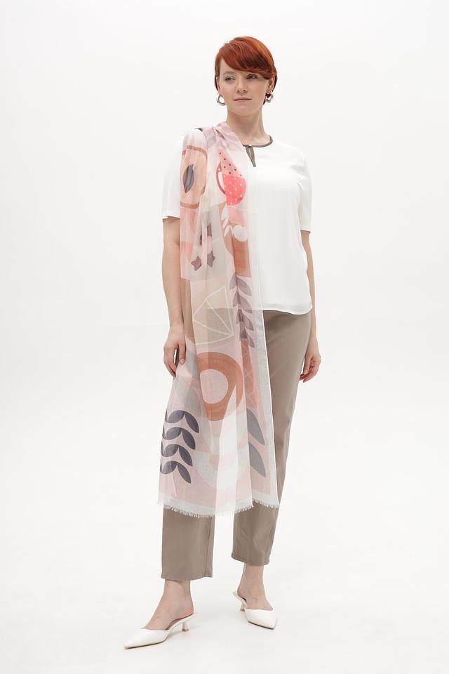 Шарф имеет прямоугольную форму и украшен нежным цветочным принтом в розово-серых тонах. Легкая и воздушная текстура материала приятна на ощупь и обеспечивает комфорт в носке. Бахрома по краям добавляет шарфу изысканности.