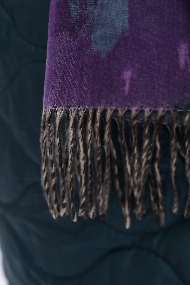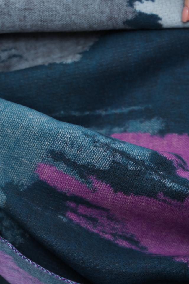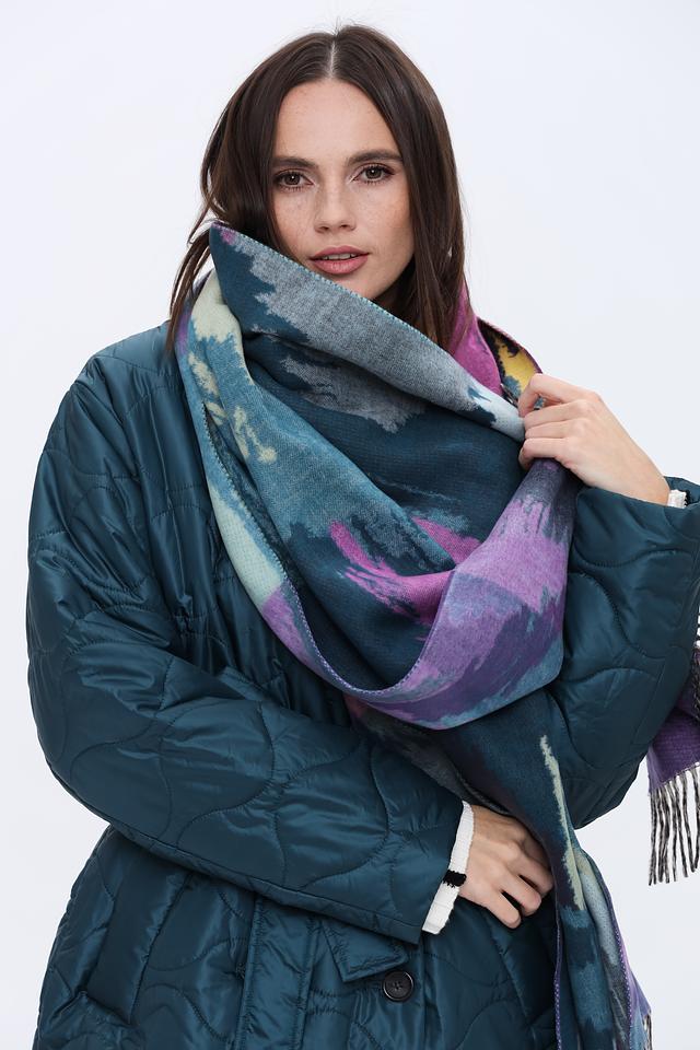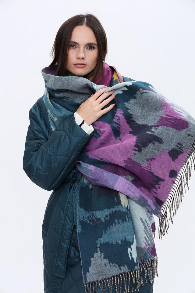 Шарф имеет оригинальный абстрактный рисунок, сочетающий в себе оттенки бирюзового, лилового и серого. Такое сочетание цветов легко сочетается с различными стилями одежды, от повседневного до более элегантного.