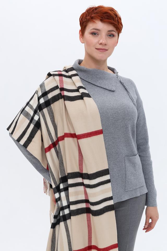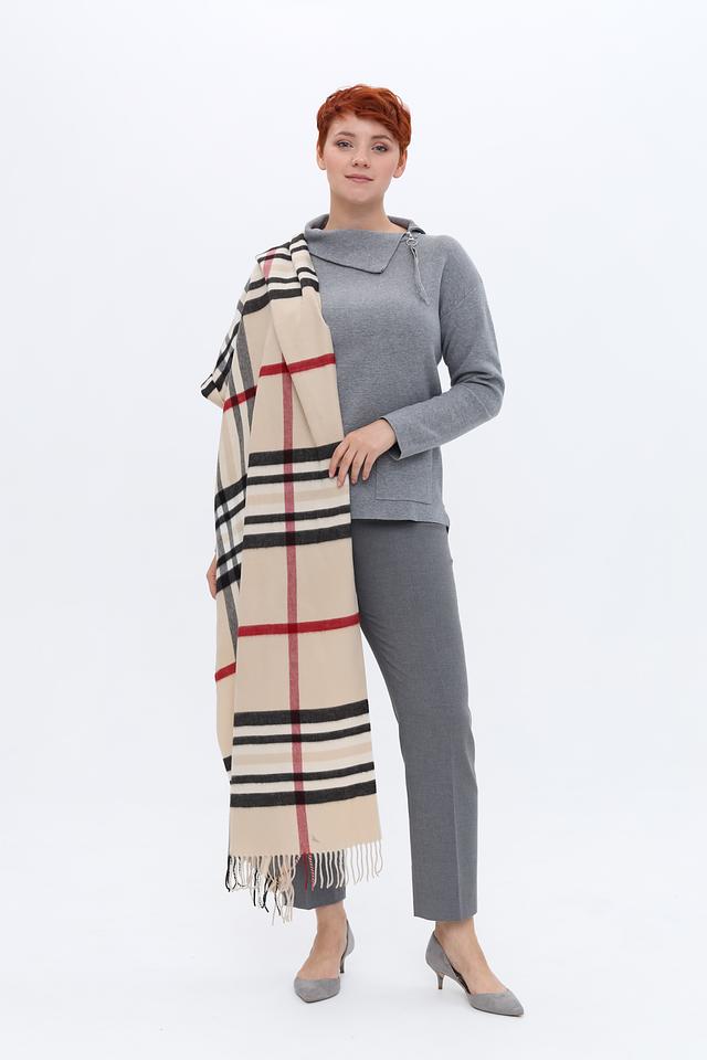 Этот шарф от Fraas – идеальный выбор для тех, кто ценит комфорт и стиль. Шарф выполнен в бежевых тонах и украшен классическим клетчатым принтом, сочетающим в себе чёрные, красные и белые полосы.