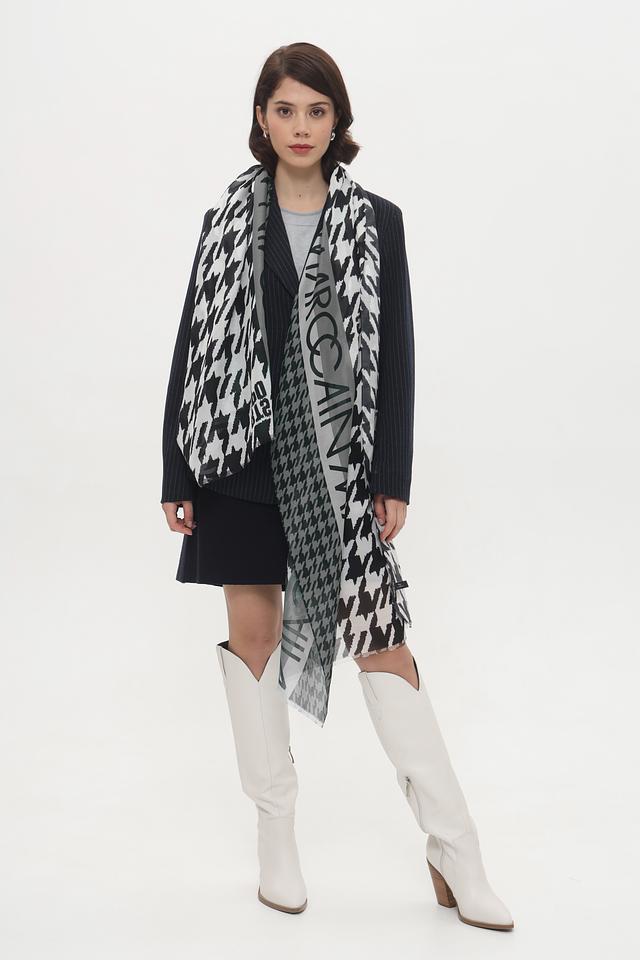 Этот шарф от Marc Cain Sports – идеальный аксессуар для создания изысканного и современного образа. Шарф выполнен в приятной цветовой гамме хаки с классическим принтом "гусиная лапка", который добавляет ему элегантности и универсальности.