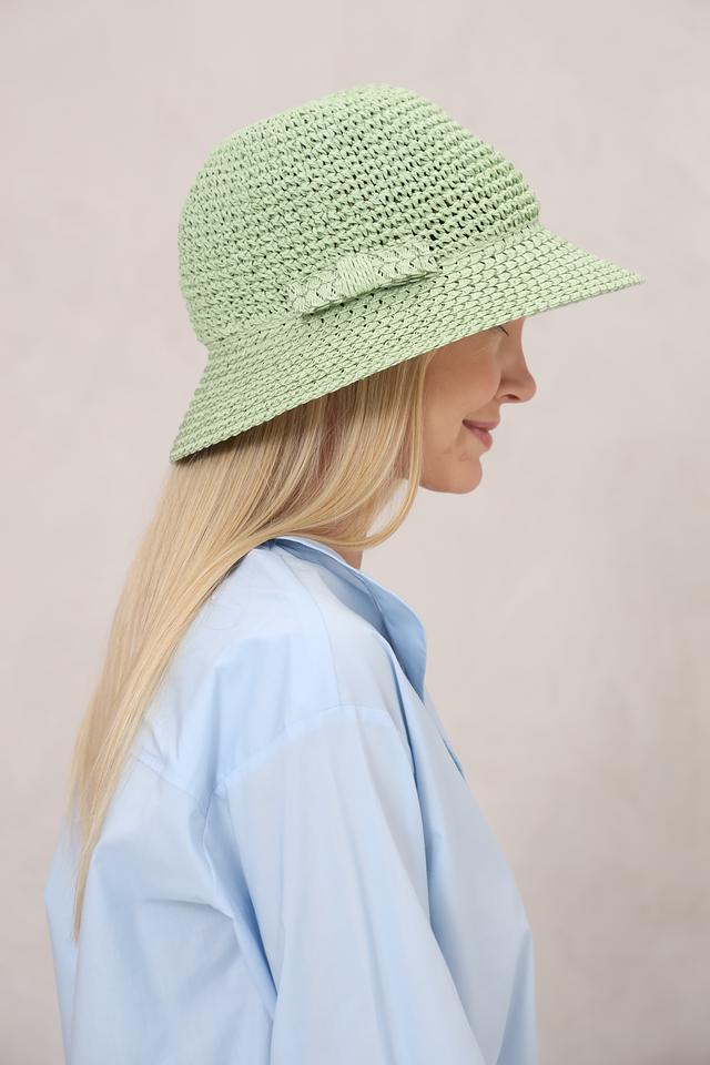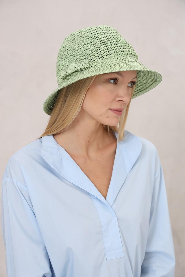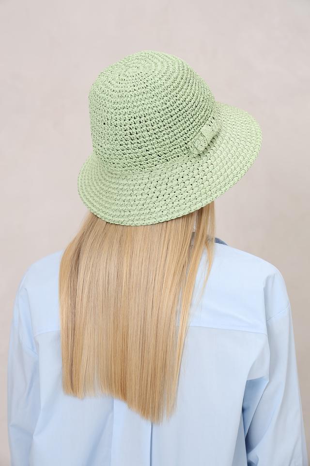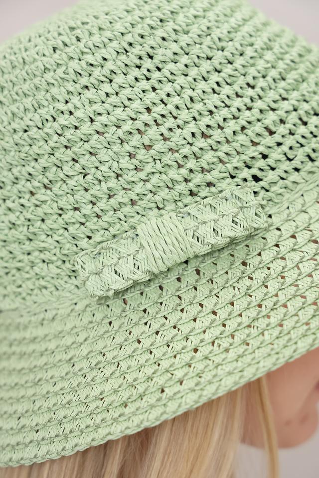 Шляпа имеет нежный мятный цвет, который освежает и гармонично сочетается с различными нарядами. Особенностью модели является декоративный бант, добавляющий изысканности.