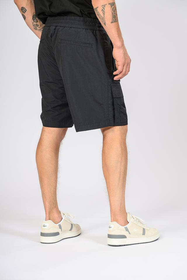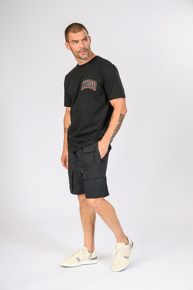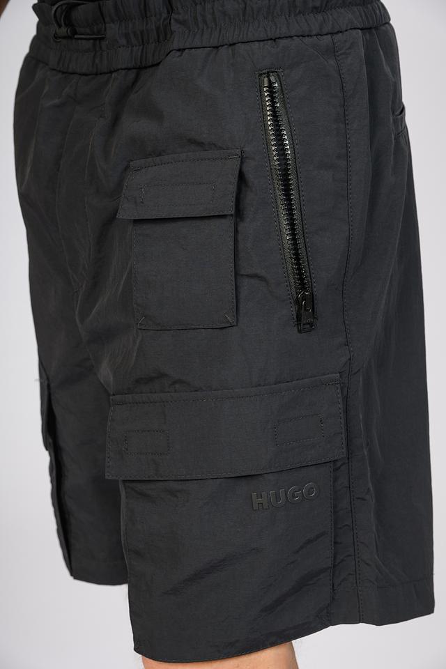 Шорты имеют прямой крой, эластичный пояс с регулирующим шнурком и несколько накладных карманов, включая карман на молнии. Логотип бренда Hugo расположен на одной из штанин.