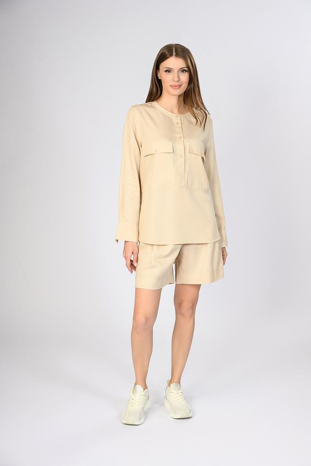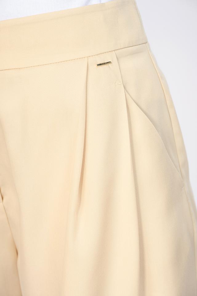 Шорты имеют прямой крой и классическую посадку по фигуре. На передней части расположены аккуратные складки, придающие изделию более изысканный вид. Застежка на молнию и пуговицу обеспечивает надежную фиксацию.
