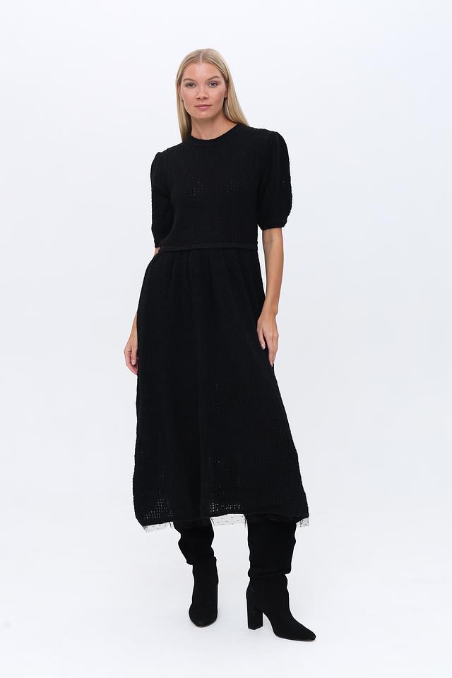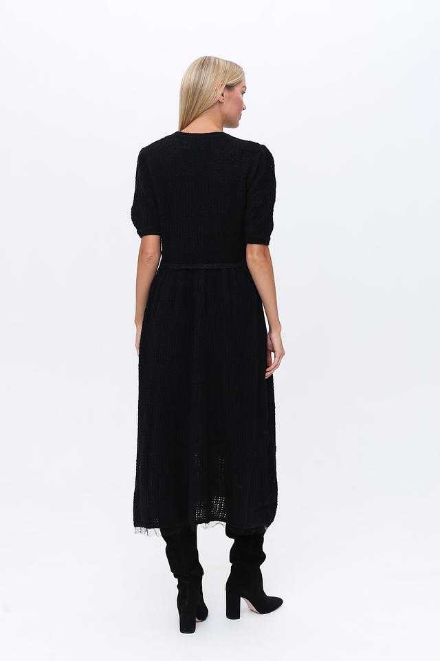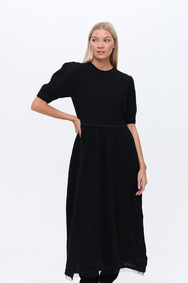 Модель выполнена из фактурного трикотажа, который придает ей особый шарм. Короткие рукава 3/4 и округлый вырез горловины делают платье удобным и практичным. Акцент на талии достигается за счет эластичной вставки, которая обеспечивает комфортную посадку.
