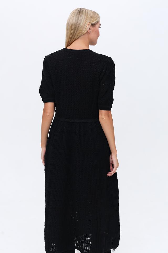 Чёрное платье Silvian Heach из фактурного трикотажа с рукавами 3/4 и акцентом на талии. Элегантный силуэт и комфортный крой делают это платье идеальным выбором для создания стильного образа. Состав: полиэстер 69%, акрил 23%, шерсть 5%, эластан 3%