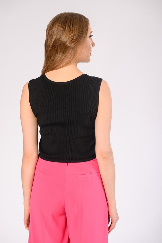 Топ выполнен из высококачественной вискозы (65%) и нейлона (35%), что обеспечивает комфорт при носке и приятные тактильные ощущения. Круглый вырез горловины и ряд декоративных пуговиц добавляют изысканности и оригинальности.