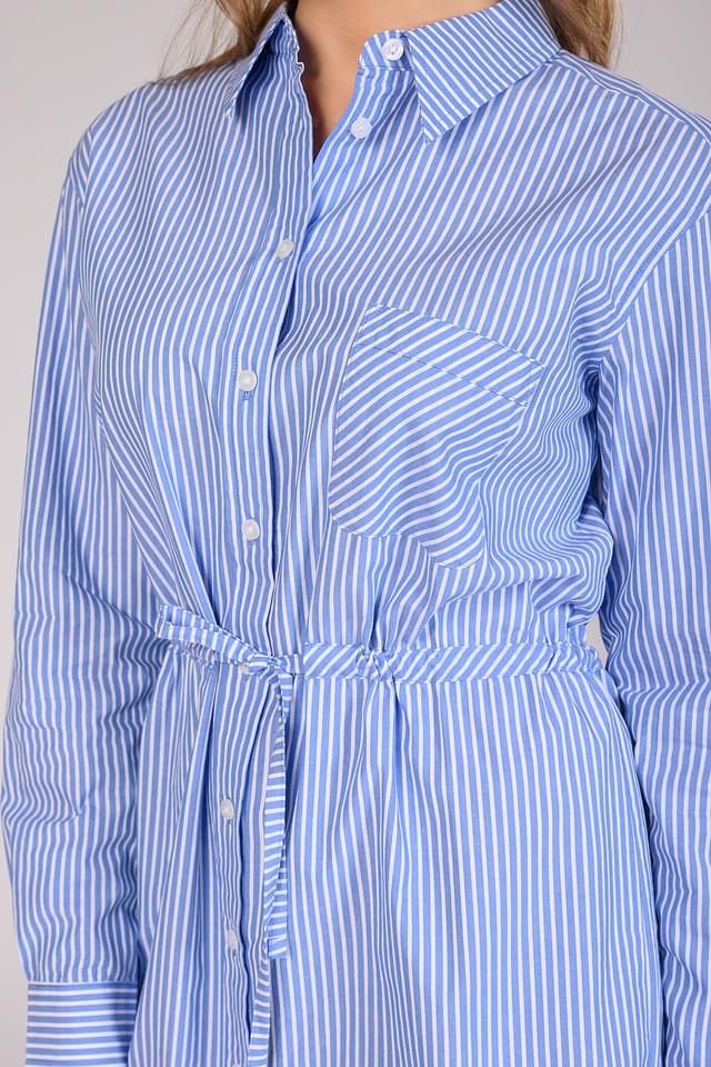 Эта блуза от Silvian Heach выполнена в классическом стиле с полосатым принтом в бело-голубой гамме. Модель имеет длинные рукава и воротник рубашечного типа.