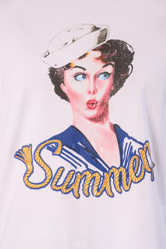 Особенности дизайна: футболка украшена крупным, детализированным принтом в стиле ретро, изображающим девушку в морской тематике. Принт выполнен в ярких цветах, что делает футболку запоминающейся и привлекательной.