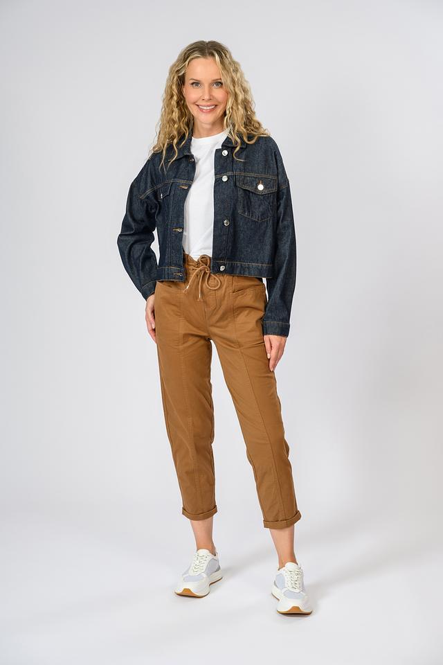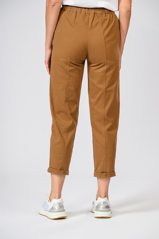 Брюки изготовлены из высококачественного хлопка с добавлением эластана (3%), что обеспечивает комфорт и свободу движений. Эластичный пояс с кулиской позволяет регулировать посадку по фигуре.