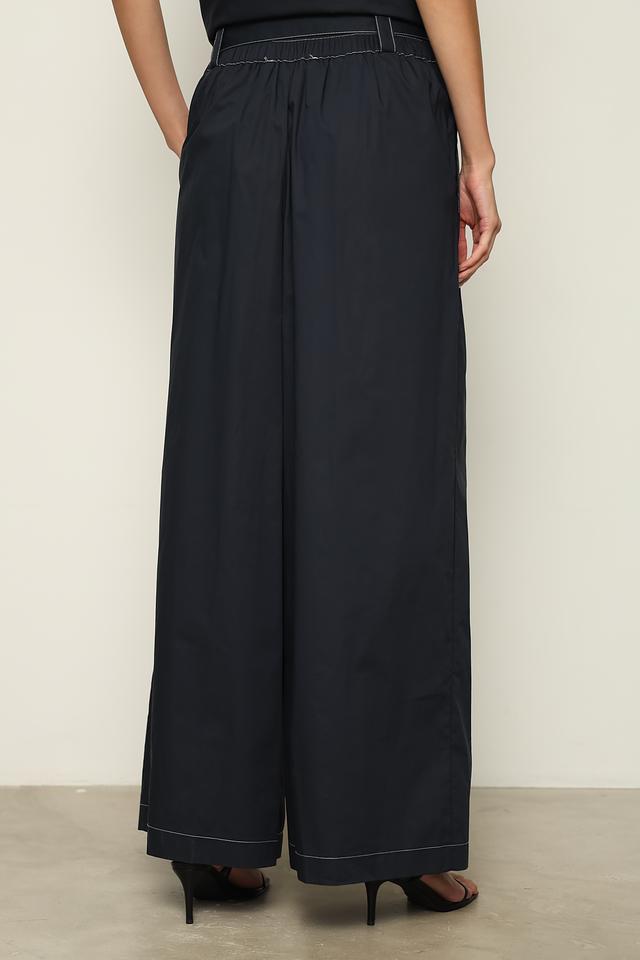 Брюки имеют завышенную талию и широкий пояс с завязками, которые подчеркивают фигуру и позволяют регулировать посадку. Прямой крой и широкие штанины обеспечивают свободу движений и создают эффектный силуэт. Декоративная отделка в виде контрастной строчки по карманам и по низу брюк добавляет изысканности и оригинальности.
