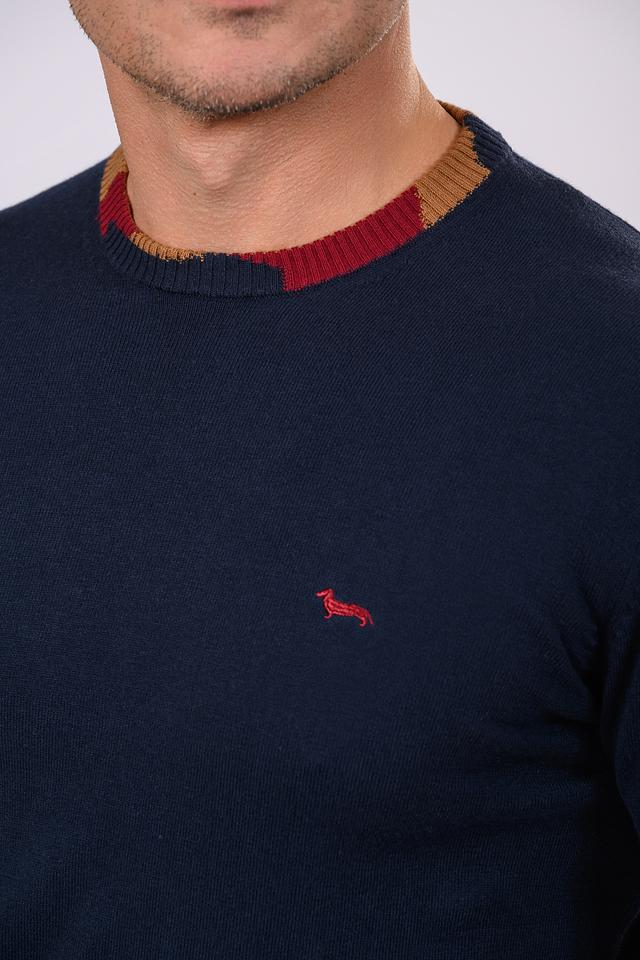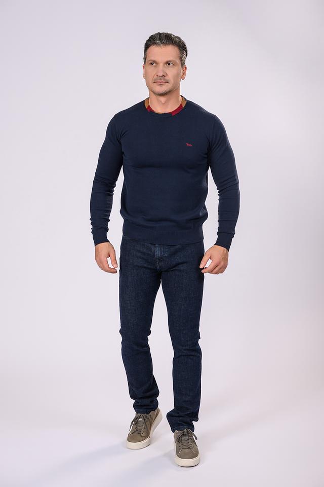 Мужской джемпер Harmont & Blaine тёмно-синего цвета с круглым вырезом и контрастной горловиной. Изготовлен из высококачественного хлопка с добавлением шерсти для мягкости и тепла. Отличается стильным дизайном и удобной посадкой. Состав: хлопок 60%, шерсть 40%