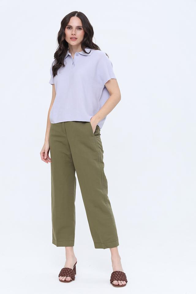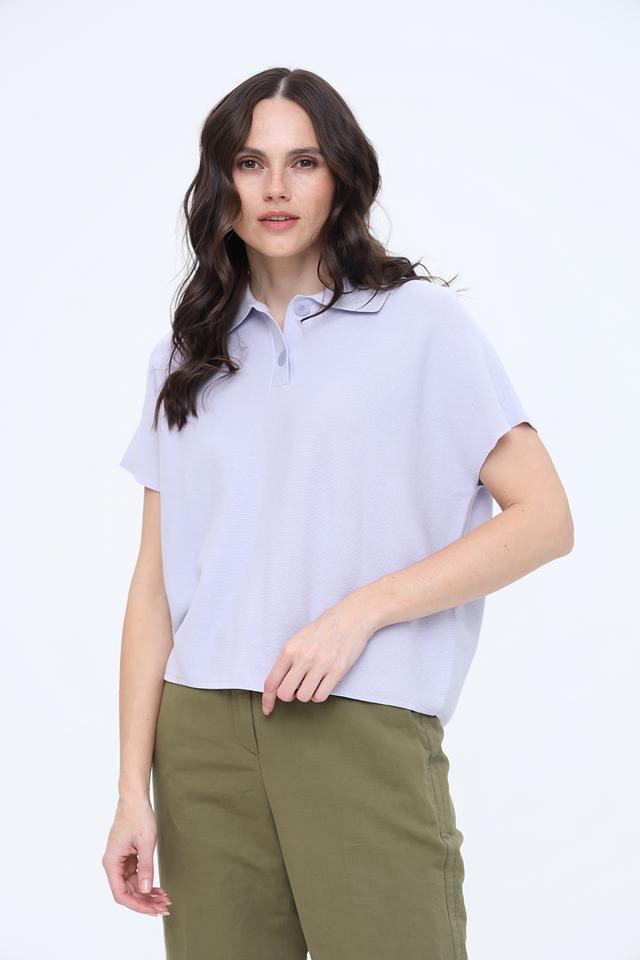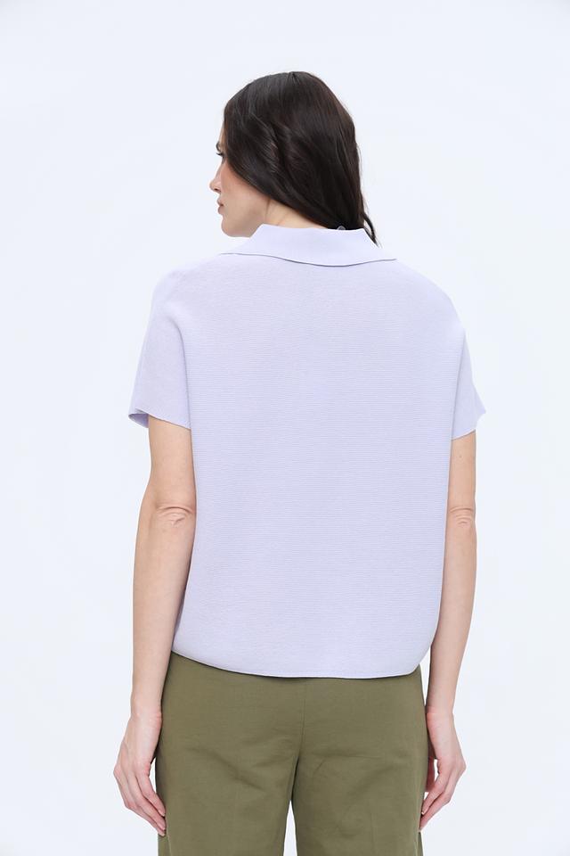 Пуловер имеет лавандовый цвет и классический крой с короткими рукавами и воротником-поло. Застёжка на одну пуговицу добавляет изысканности. Текстура ткани слегка рельефная, что придаёт изделию дополнительный объём и интерес.